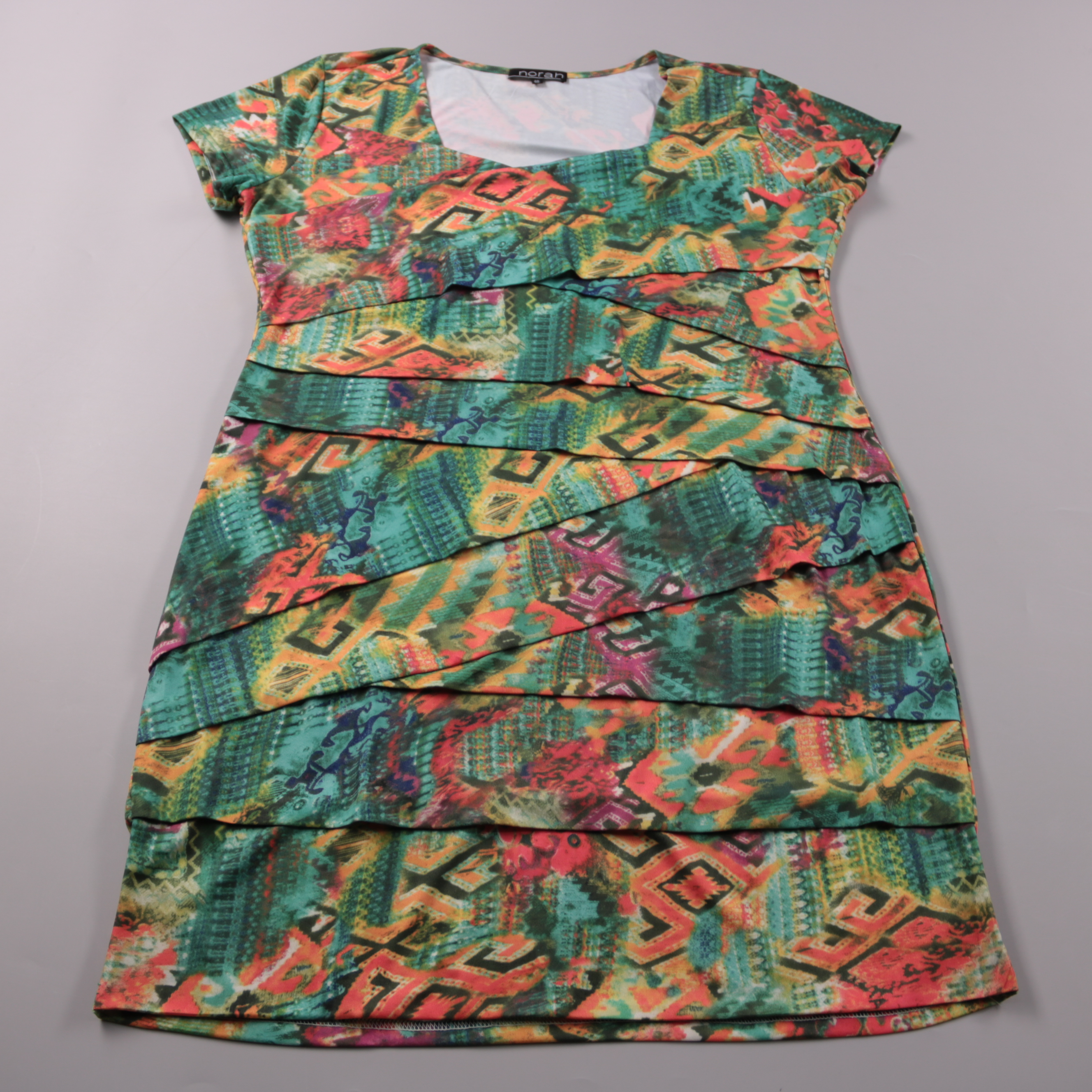 Повседневное платье Norah с ярким геометрическим принтом и декоративными горизонтальными воланами по всей длине. Подойдёт для города и отдыха летом или в демисезон с жакетом. Практичный плюс — синтетическая ткань почти не мнётся и быстро сохнет.