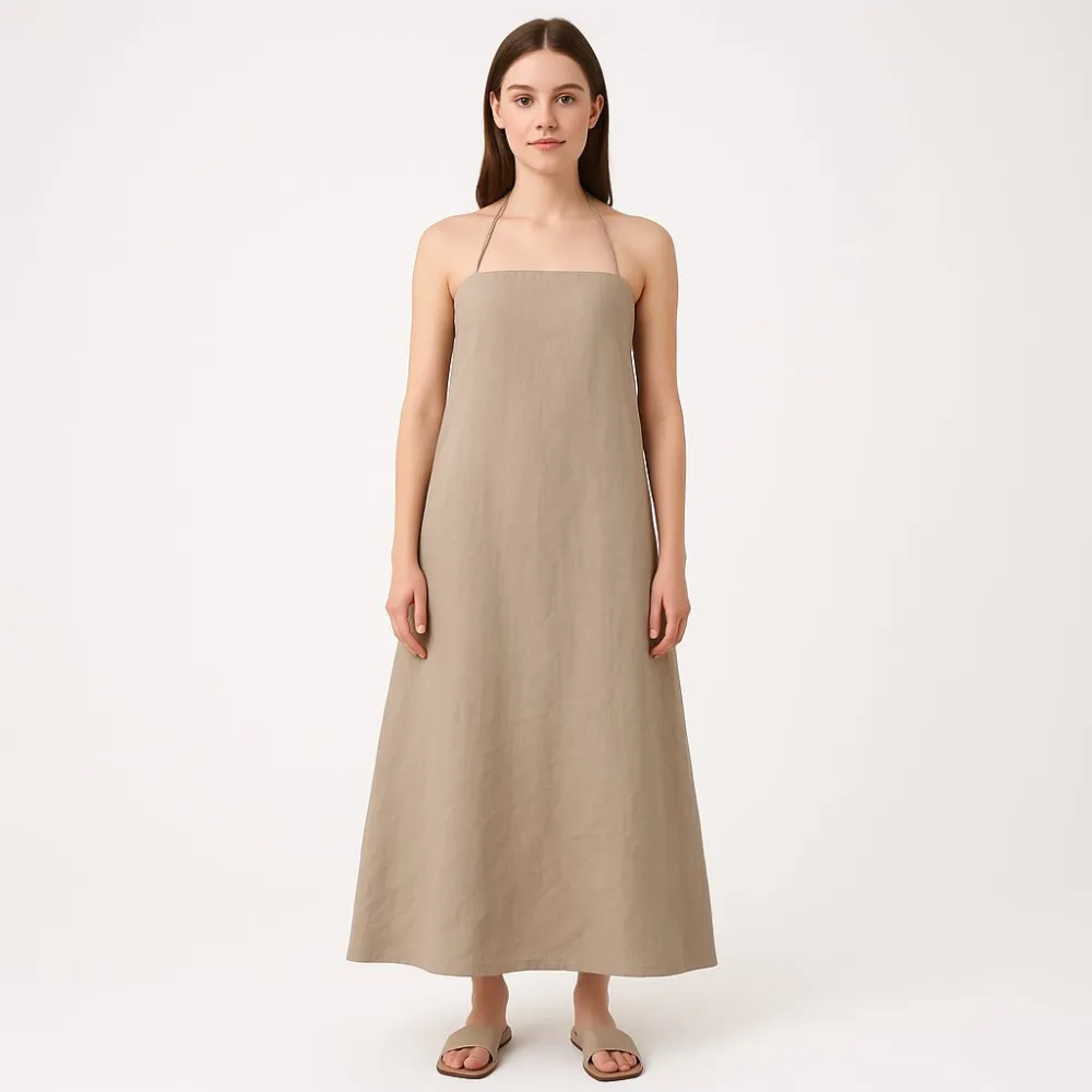 Летнее платье-сарафан Studio Clip в бежевом цвете, длины миди/макси, на тонких бретелях через шею и с прямым верхом. Подойдёт для повседневной носки, отпуска и прогулок в жаркую погоду. Ткань лёгкая и практичная в уходе, почти не мнётся.
