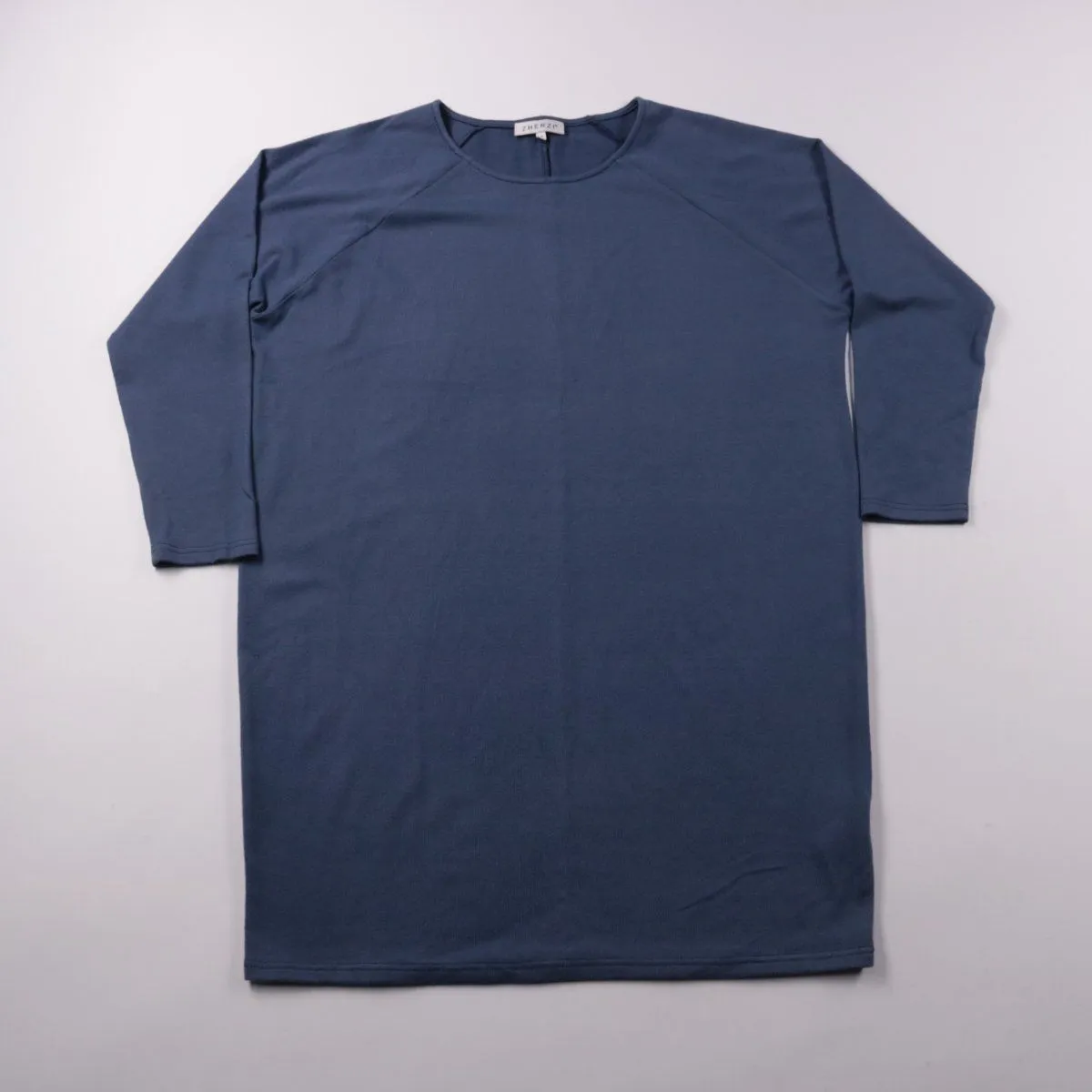 Повседневное платье Zhenzi в спокойном синем цвете, прямого кроя с рукавом 3/4 и круглой горловиной. Подойдёт для офиса и на каждый день, легко сочетается с кедами, ботинками или обувью на каблуке. Практичный плюс — немнущийся эластичный материал, который хорошо держит форму.