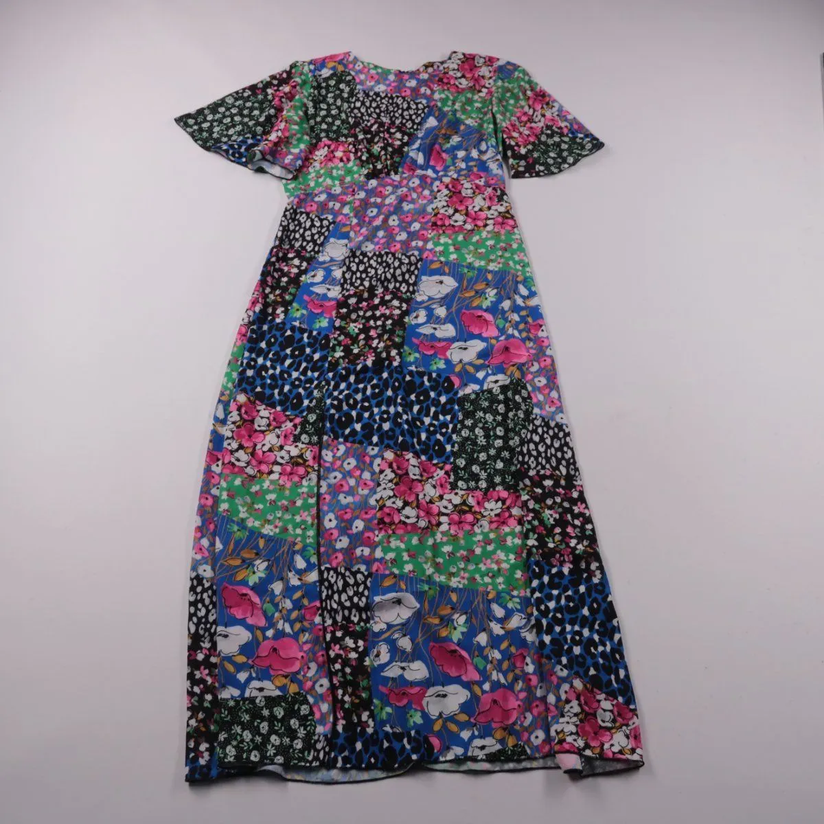 Женское повседневное платье-макси с короткими рукавами и ярким принтом в стиле пэчворк (цветочные и анималистичные элементы). Подойдёт для летних прогулок и повседневных образов благодаря свободному крою. Практичное преимущество — ткань выглядит немнущейся и не требует сложного ухода.