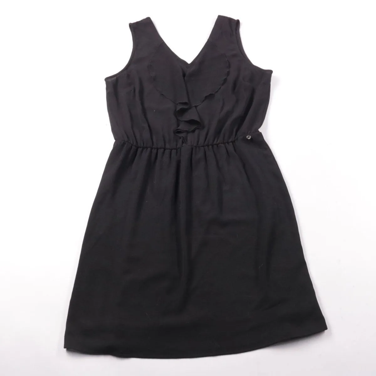 Черное повседневное платье JBC без рукавов с V-образным вырезом и декоративной оборкой спереди. Подойдет для лета, офиса или прогулок — легко сочетать с жакетом и обувью на каждый день. Эластичная талия и подкладка делают посадку комфортной и удобной в носке.