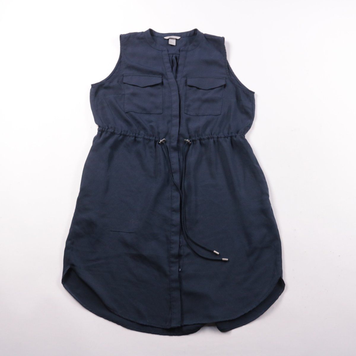 Повседневное платье-рубашка H&M без рукавов в тёмно-синем цвете, с накладными карманами на груди и планкой спереди. Подойдёт для лета и тёплой погоды, на каждый день или в офис с жакетом. Кулиска на талии помогает регулировать посадку и подчёркивает силуэт.