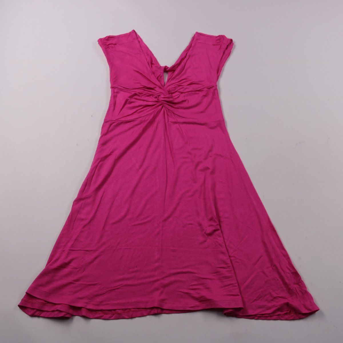 Женское повседневное платье без бренда, ярко-розового цвета, с V-образным вырезом и узлом/драпировкой на груди. Подойдёт для лета, отдыха и повседневных выходов, лёгкая ткань красиво драпируется. Вискоза с добавлением эластана хорошо тянется и комфортно сидит по фигуре.