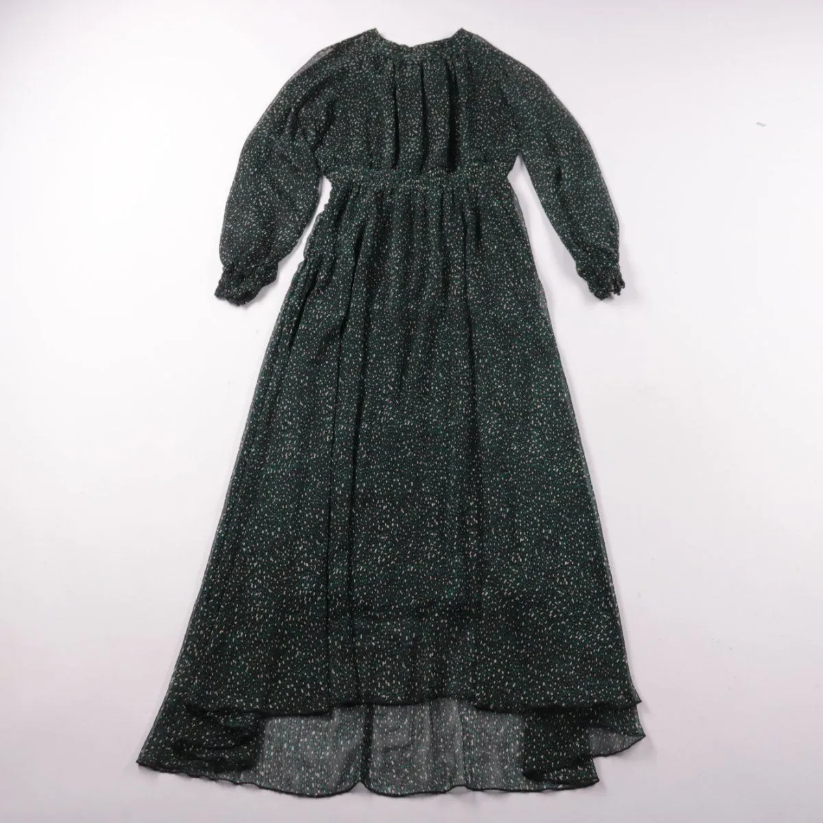 Длинное платье Zara из лёгкой ткани с мелким принтом и рукавами на манжетах, талия на резинке. Подойдёт для повседневных образов в городе и на прогулки в прохладную погоду. Практичный плюс — не мнётся и быстро сохнет благодаря полиэстеру.