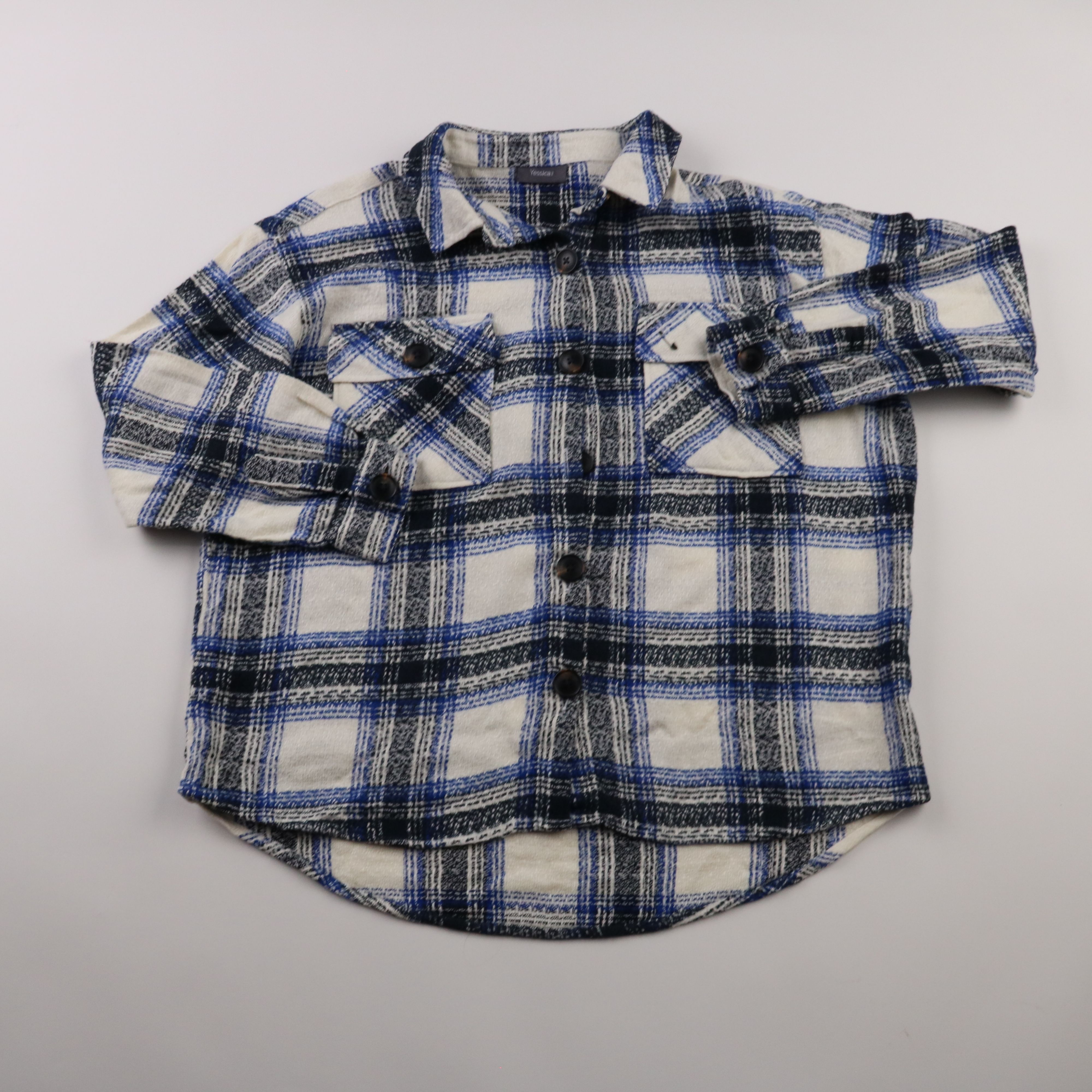 Рубашка Yessica в крупную клетку белого, синего и чёрного цветов, с длинным рукавом и накладными карманами. Подойдёт для повседневных образов и как лёгкая верхняя рубашка на прохладную погоду. Плотный акриловый материал хорошо держит форму и не требует...