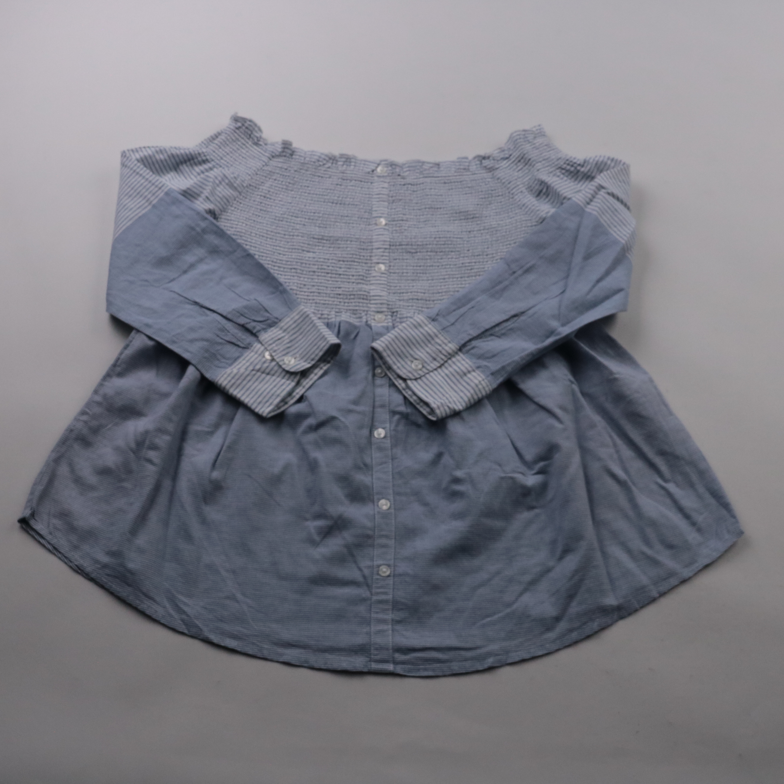 Женская блузка с открытыми плечами и эластичным верхом, в голубом цвете с полосатой отделкой. Подойдёт для повседневных образов летом и в тёплые дни, хорошо сочетается с джинсами или юбкой. Пуговичная планка и манжеты делают посадку удобной и аккуратной.