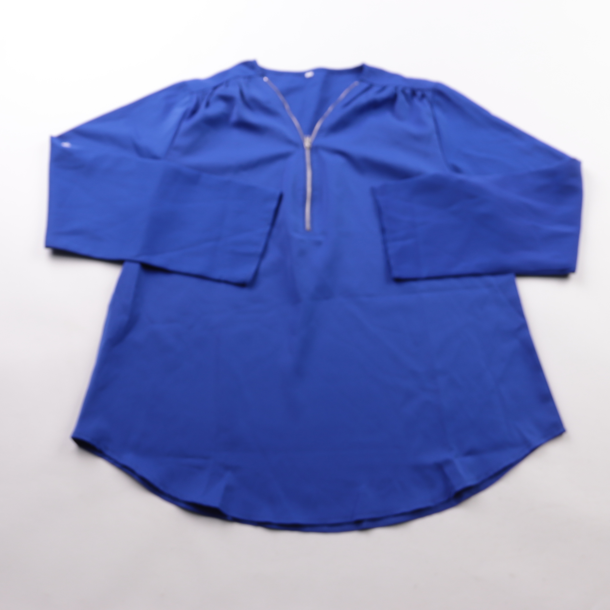 Женская блузка на молнии спереди, свободного кроя с длинным рукавом, в ярком синем цвете. Подойдёт для офиса и на каждый день — легко сочетается с брюками и юбками. Практичный материал из полиэстера почти не мнётся и быстро сохнет.