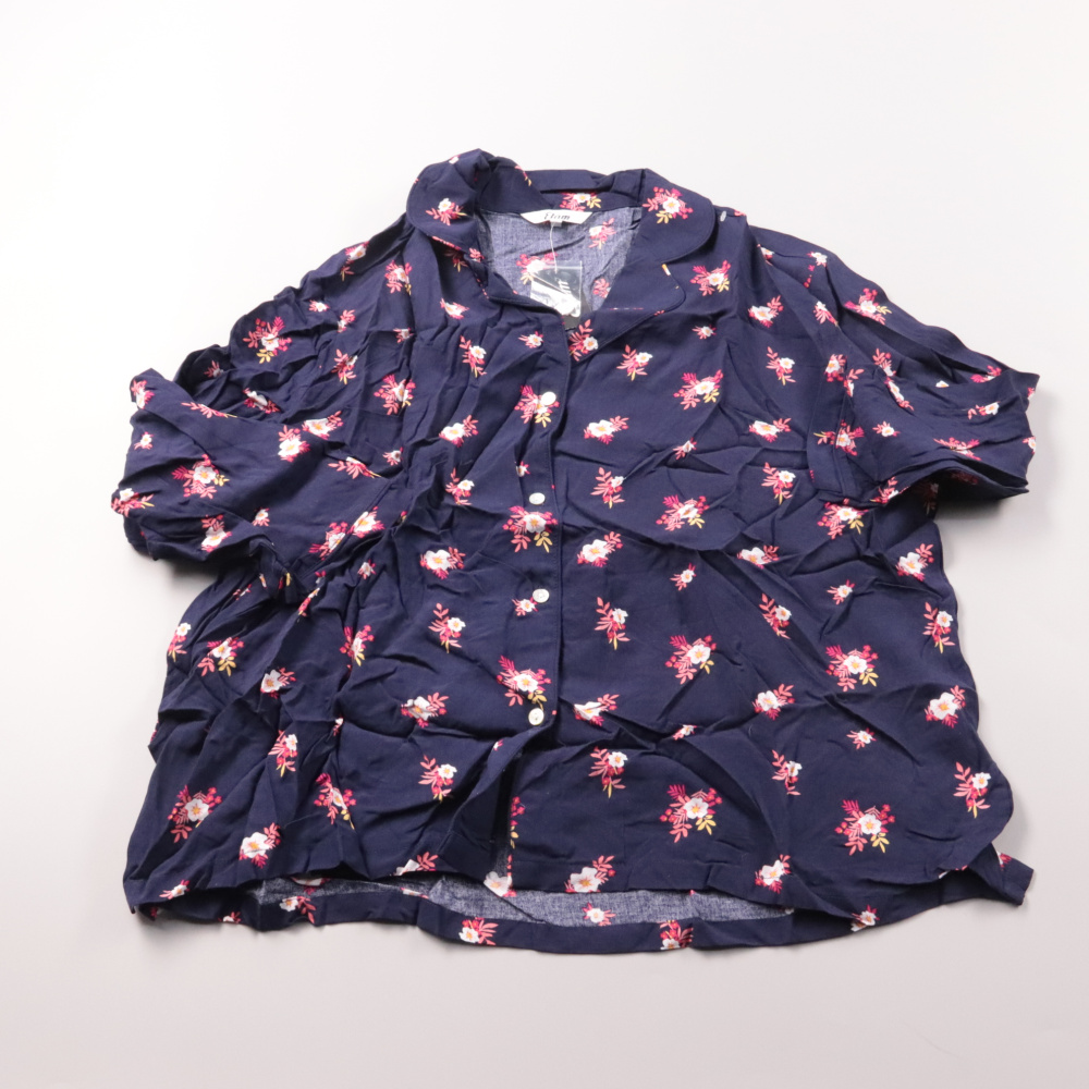 Женская блузка Etam тёмно-синего цвета с цветочным принтом и коротким рукавом. Подойдёт для повседневных летних образов и отдыха, легко сочетается с джинсами или юбкой. Лёгкая ткань и застёжка на пуговицах делают её удобной в носке.