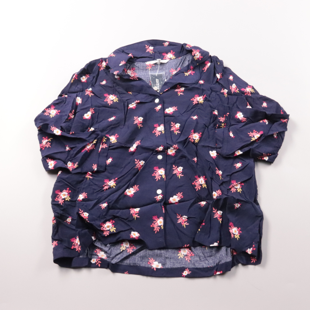 Блузка Etam тёмно-синего цвета с цветочным принтом и застёжкой на пуговицы. Подойдёт для повседневных образов и офиса в тёплую погоду, хорошо сочетается с джинсами и юбкой. Лёгкая ткань комфортна в носке и не сковывает движения.