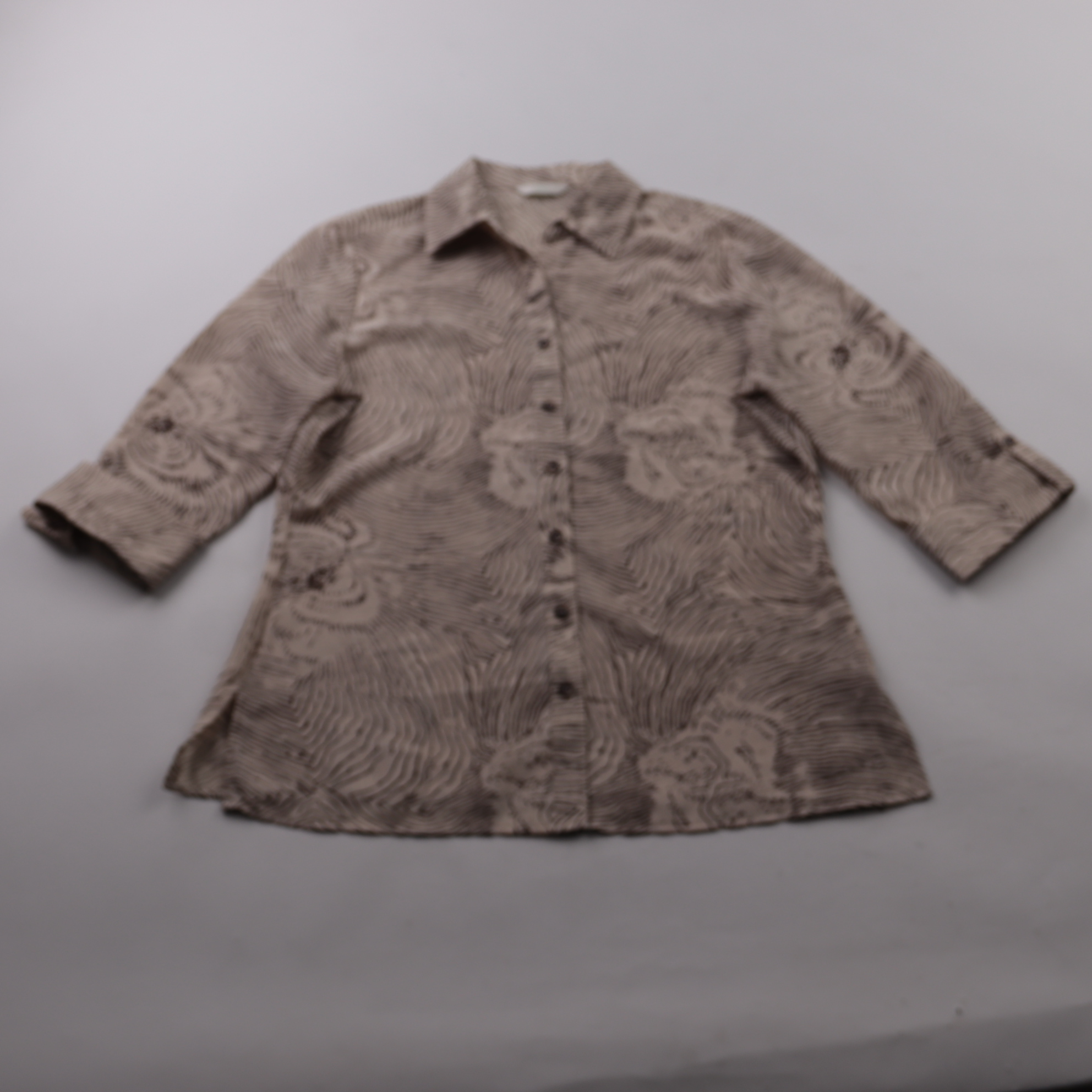 Блузка Marks & Spencer из лёгкого полиэстера с абстрактным принтом и застёжкой на пуговицы. Подойдёт для офиса и на каждый день, хорошо сочетается с брюками или джинсами. Ткань почти не мнётся и проста в уходе.