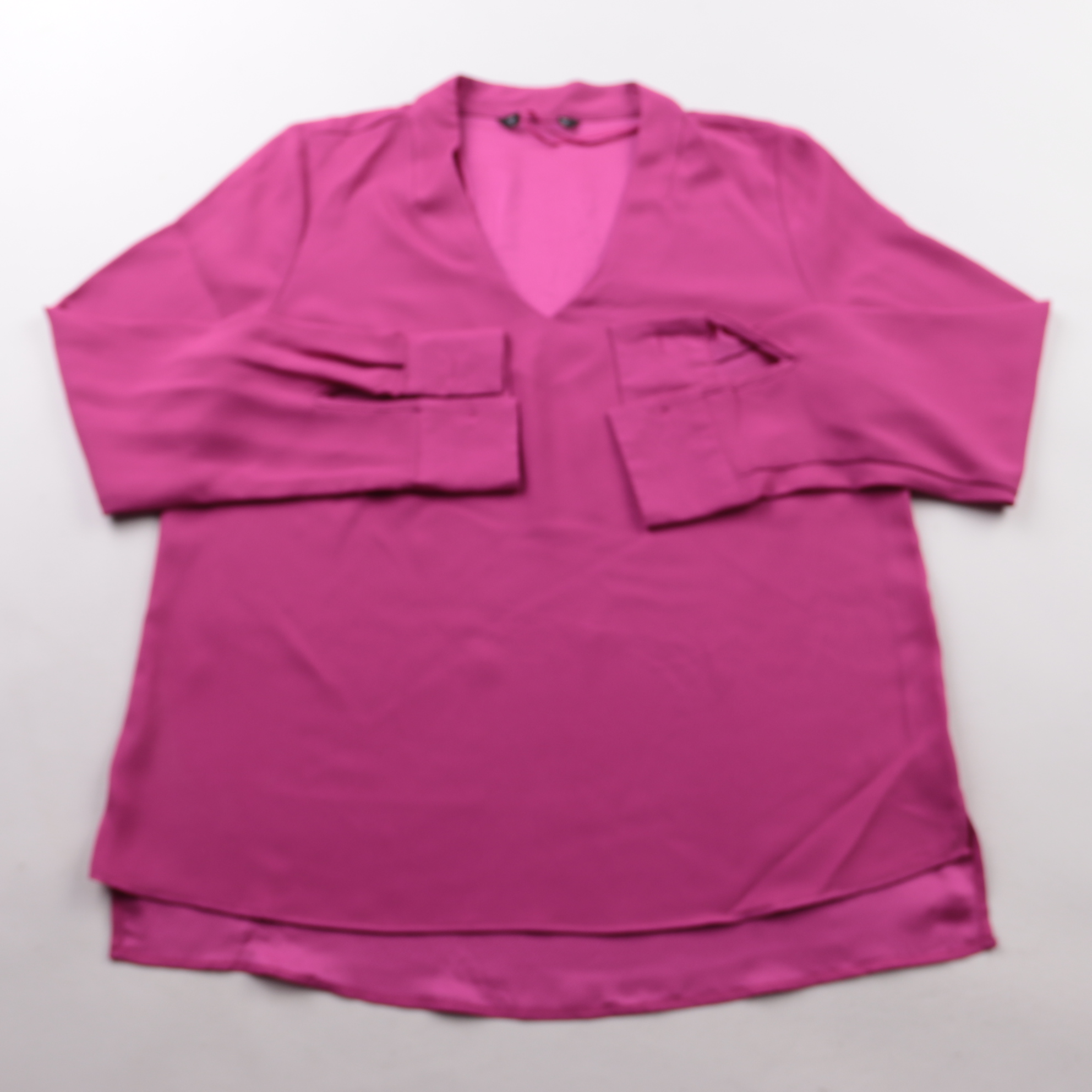 Розовая блузка с V-образным вырезом и укороченным рукавом, спереди два накладных кармана. Подойдёт для офиса и на каждый день, хорошо сочетается с брюками и юбками. Практичный плюс — лёгкая ткань и свободная посадка, не стесняет движения.