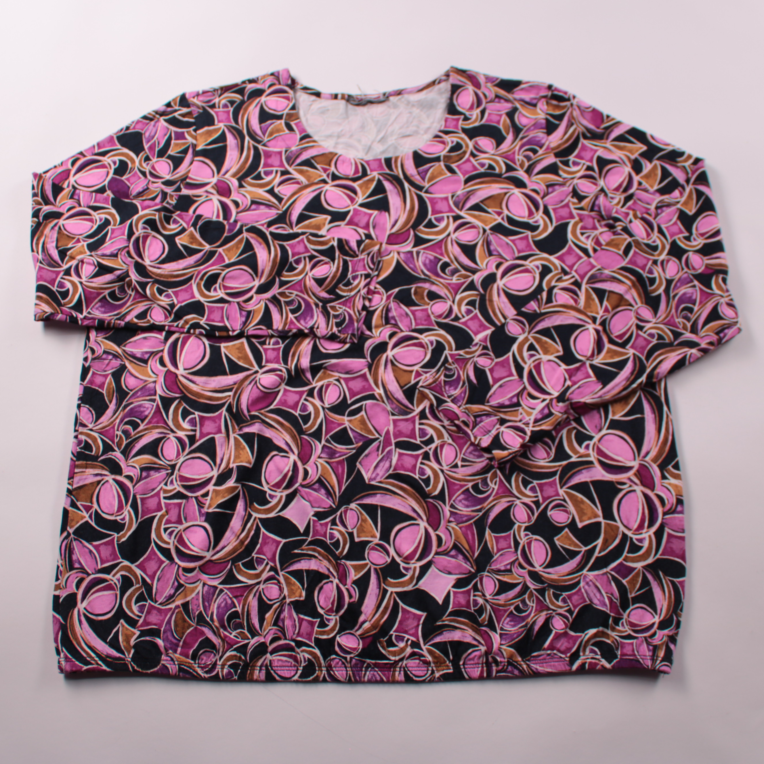 Женская блузка Signature (btx) с ярким абстрактным принтом в розово-фиолетовой гамме и круглым вырезом. Подойдёт для повседневных образов и офиса с однотонным низом. Практичный плюс — эластичная вискоза, приятная к телу и почти не мнётся.