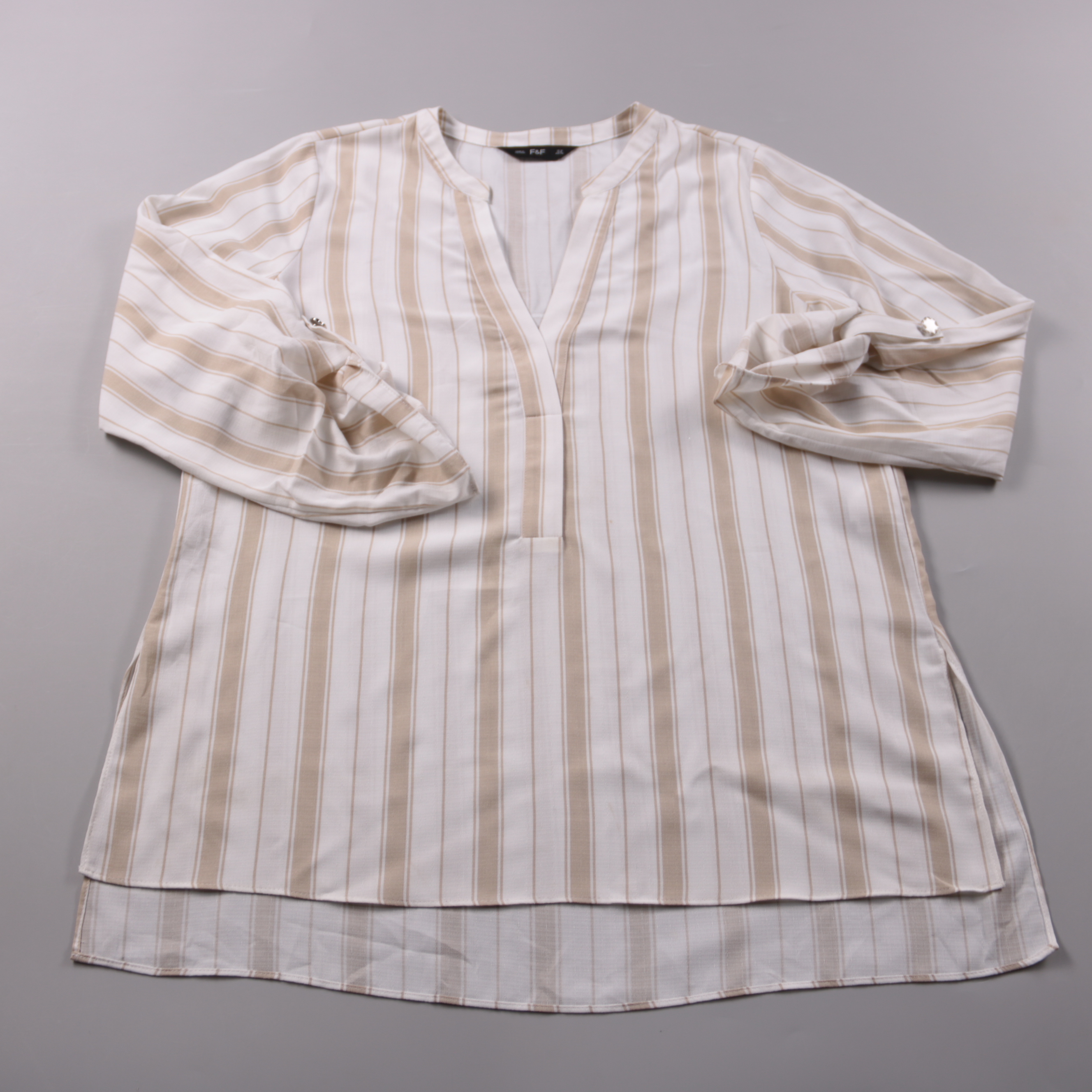 Блузка F&F в бело-бежевую вертикальную полоску с V-образным вырезом и рукавами 3/4 на пате. Подойдёт для офиса и повседневных образов, хорошо сочетается с брюками и джинсами. Лёгкая ткань и удлинённая спинка делают её удобной для носки навыпуск.