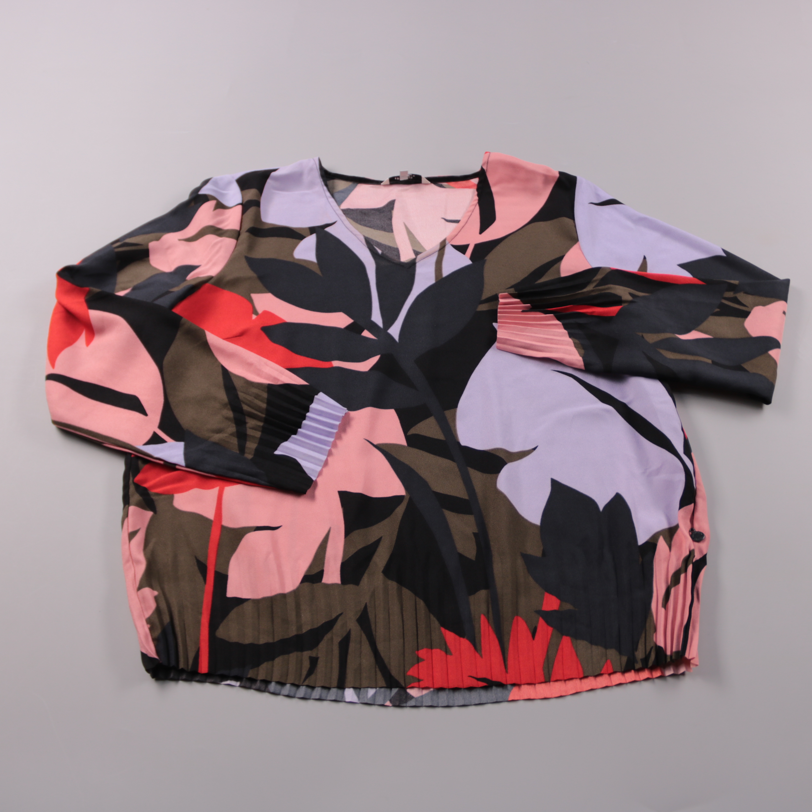 Блузка Sandwich с ярким растительным принтом и V-образным вырезом, рукава 3/4 с плиссированными манжетами. Подойдёт для офиса и повседневных выходов, легко сочетается с однотонными брюками или юбкой. Практичный материал почти не мнётся и быстро сохнет.