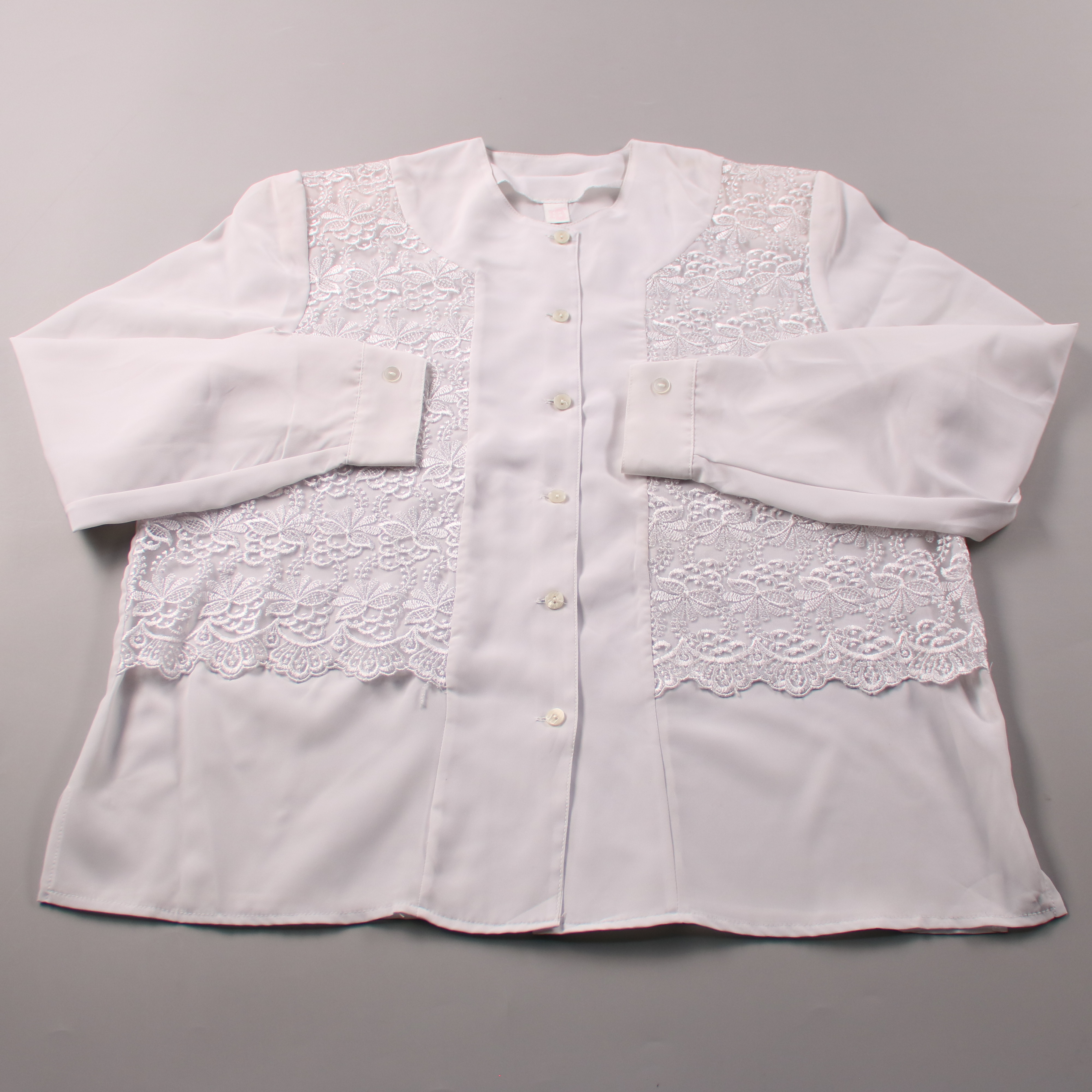 Женская белая блузка с длинным рукавом и застёжкой на пуговицы, с кружевными вставками спереди. Подойдёт для офиса, школы или нарядных повседневных образов. Лёгкая ткань и аккуратные манжеты делают её удобной в носке и легко сочетаемой с юбками и брюками.