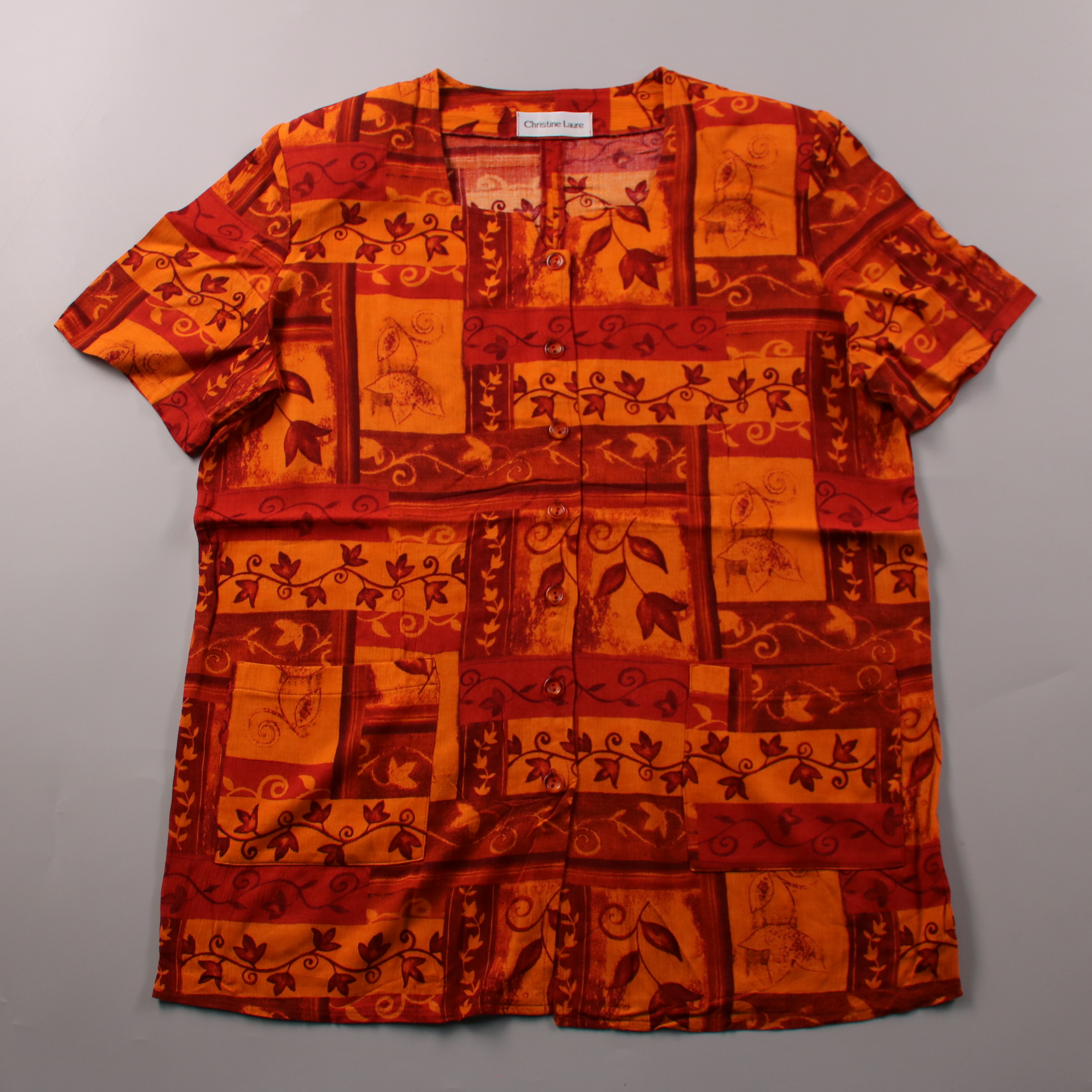 Женская блузка Christine Laure с коротким рукавом и застёжкой на пуговицы, в ярком оранжево-бордовом принте с растительными мотивами. Подойдёт для лета и тёплой погоды, хорошо смотрится в повседневных образах с джинсами или однотонными брюками. Лёгкая ...