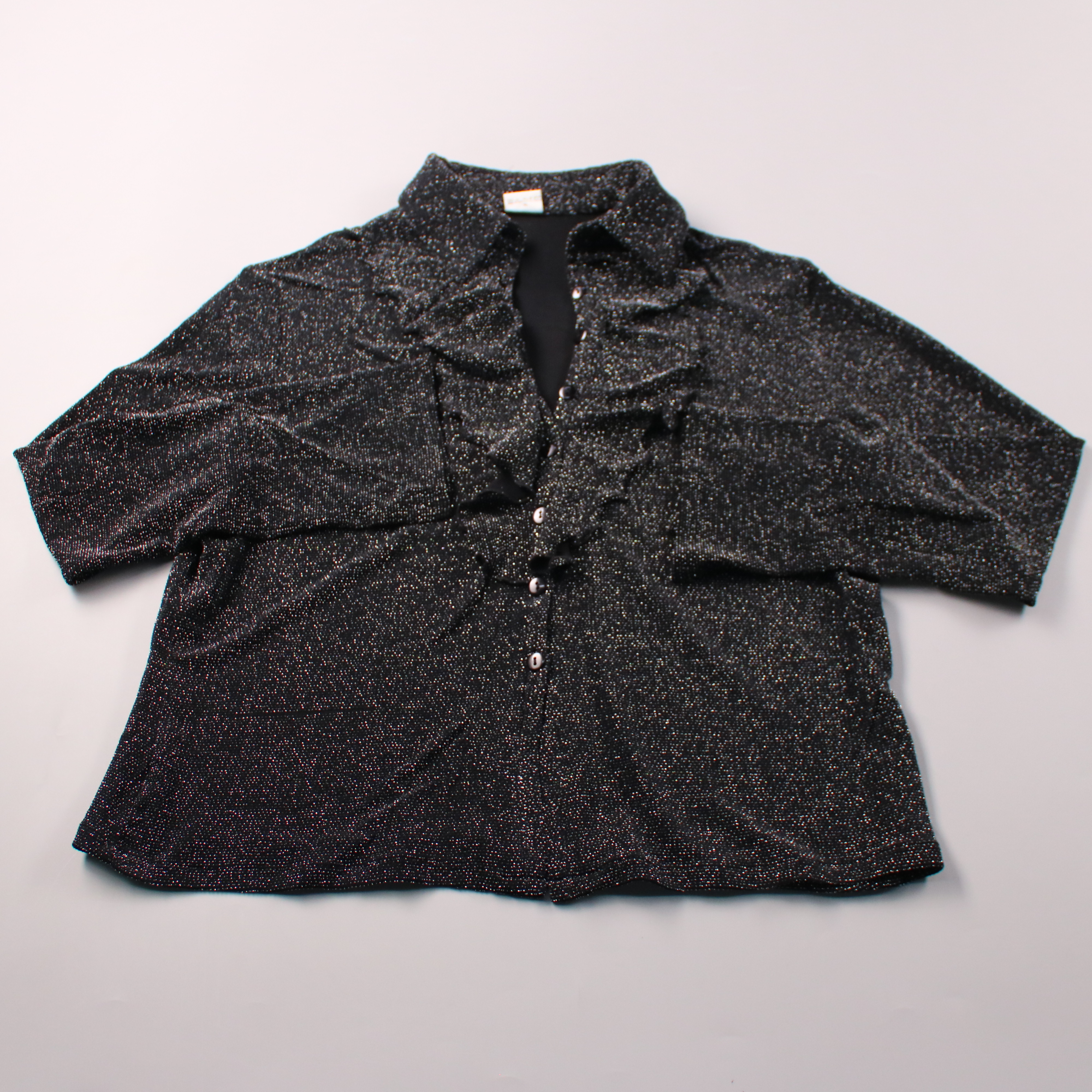 Женская блузка с люрексом, с коротким рукавом и застёжкой на пуговицы, ткань с выраженным блеском. Подойдёт для вечерних выходов и праздников, а также для акцента в повседневном образе с джинсами или брюками. Материал тянется и комфортно садится по фиг...