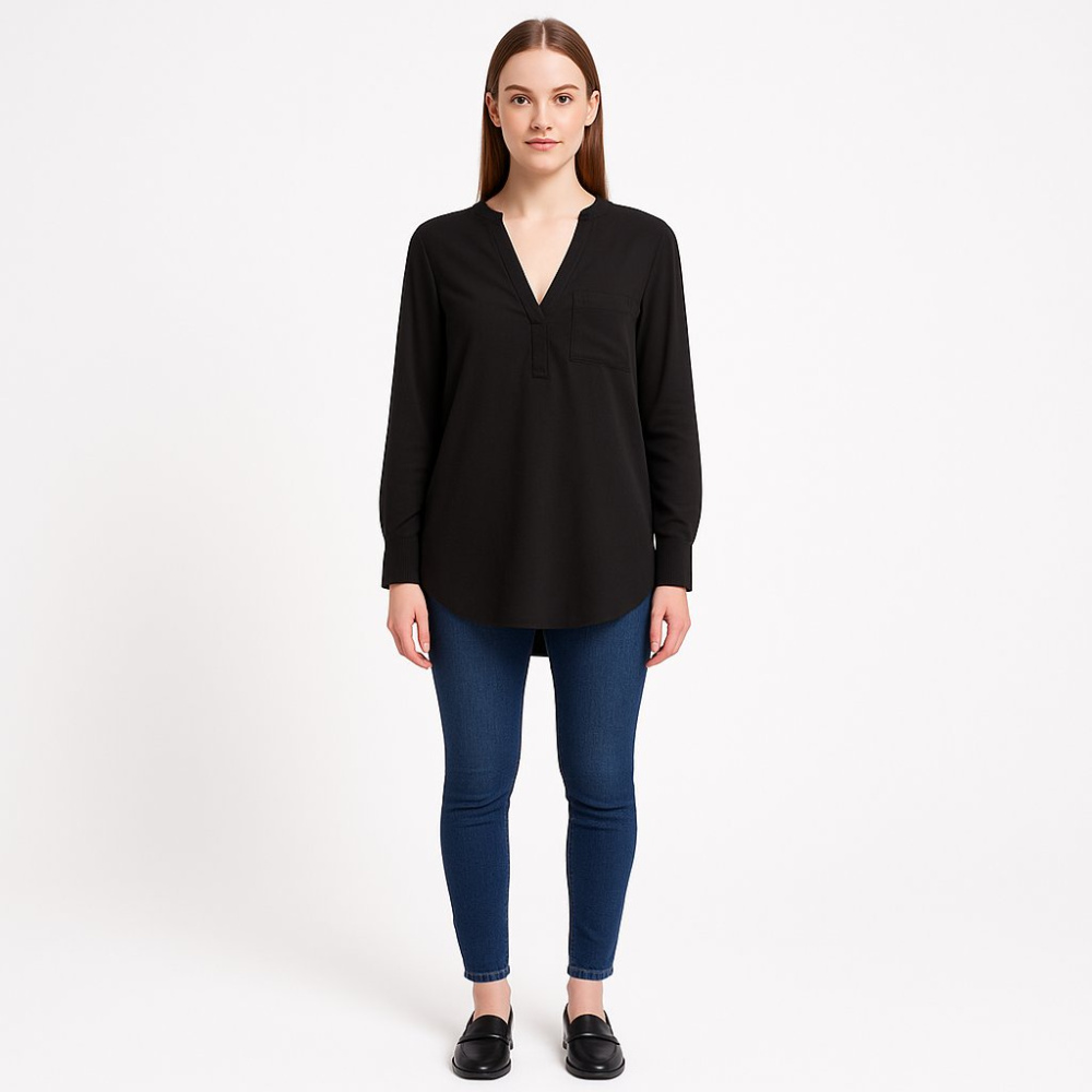 Черная блузка Jacqueline de Yong с длинным рукавом и лаконичным V‑вырезом. Подойдет для офиса и повседневных образов, легко сочетается с джинсами и классическими брюками. Практичная ткань из полиэстера почти не мнется и проста в уходе.