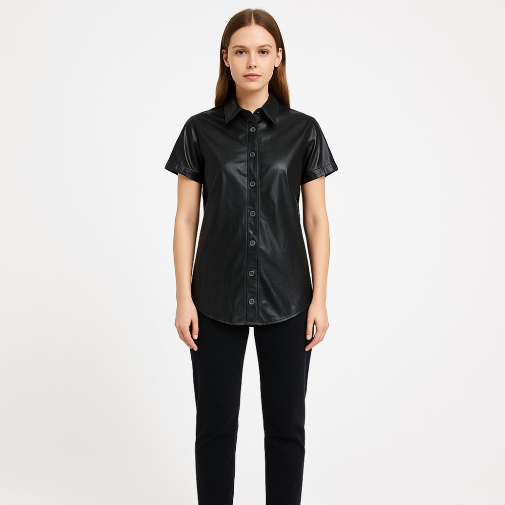 Женская рубашка из эко-кожи, без бренда, с коротким рукавом и застёжкой на пуговицы. Подойдёт для повседневных и вечерних образов с джинсами или брюками. Материал легко протирается и не требует сложного ухода.