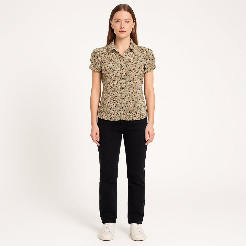 Женская блузка Biaggini с коротким рукавом и мелким цветочным принтом в бежево-коричневой гамме. Подойдёт для лета и тёплой погоды, удобно носить в офис, на прогулки и на каждый день. Лёгкая ткань и классический воротник легко сочетаются с джинсами и б...