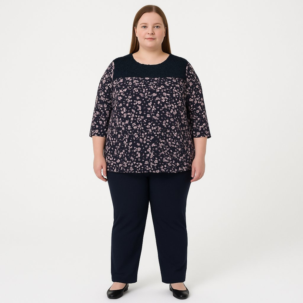 Женская блузка Street One тёмно-синего цвета с мелким цветочным принтом и вставкой из кружева в верхней части. Подойдёт для повседневных образов и офиса с нестрогим дресс-кодом, хорошо сочетается с брюками и джинсами. Мягкий материал и свободная посадк...