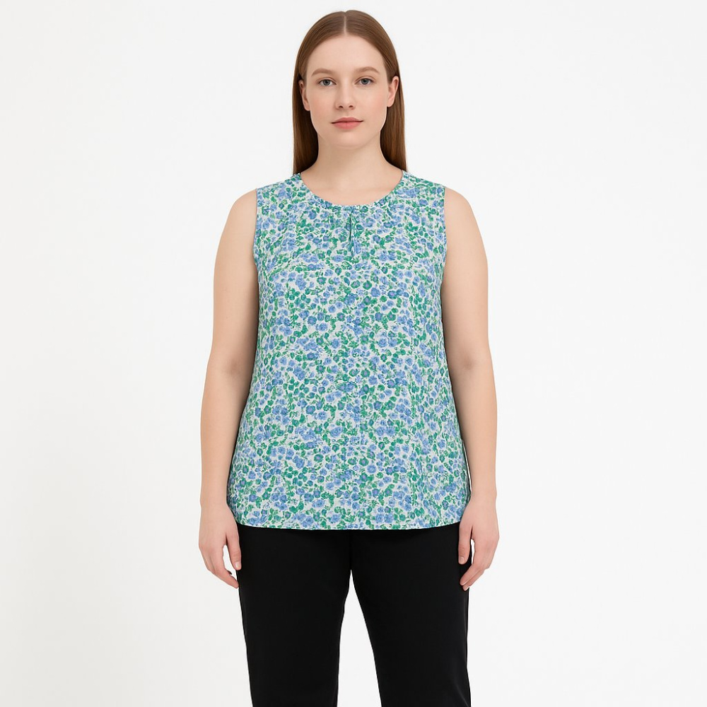 Женская блузка без рукавов с цветочным принтом в голубо-зелёной гамме. Подойдёт для лета и тёплого межсезонья, удобно носить и в офисе, и в повседневных образах. Лёгкая ткань и свободная посадка обеспечивают комфорт в течение дня.