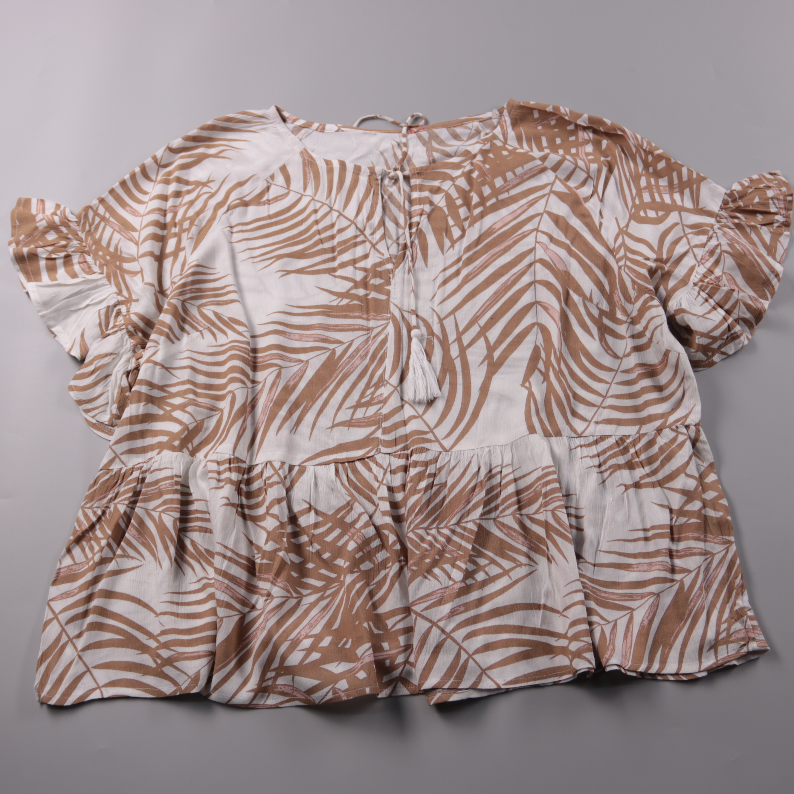 Лёгкая женская блузка из 100% вискозы с тропическим принтом и завязками с кисточками у горловины. Подойдёт для лета и отпуска, хорошо смотрится с шортами, джинсами или юбкой. Свободный крой и воланы на рукавах дают комфорт и не стесняют движения.
