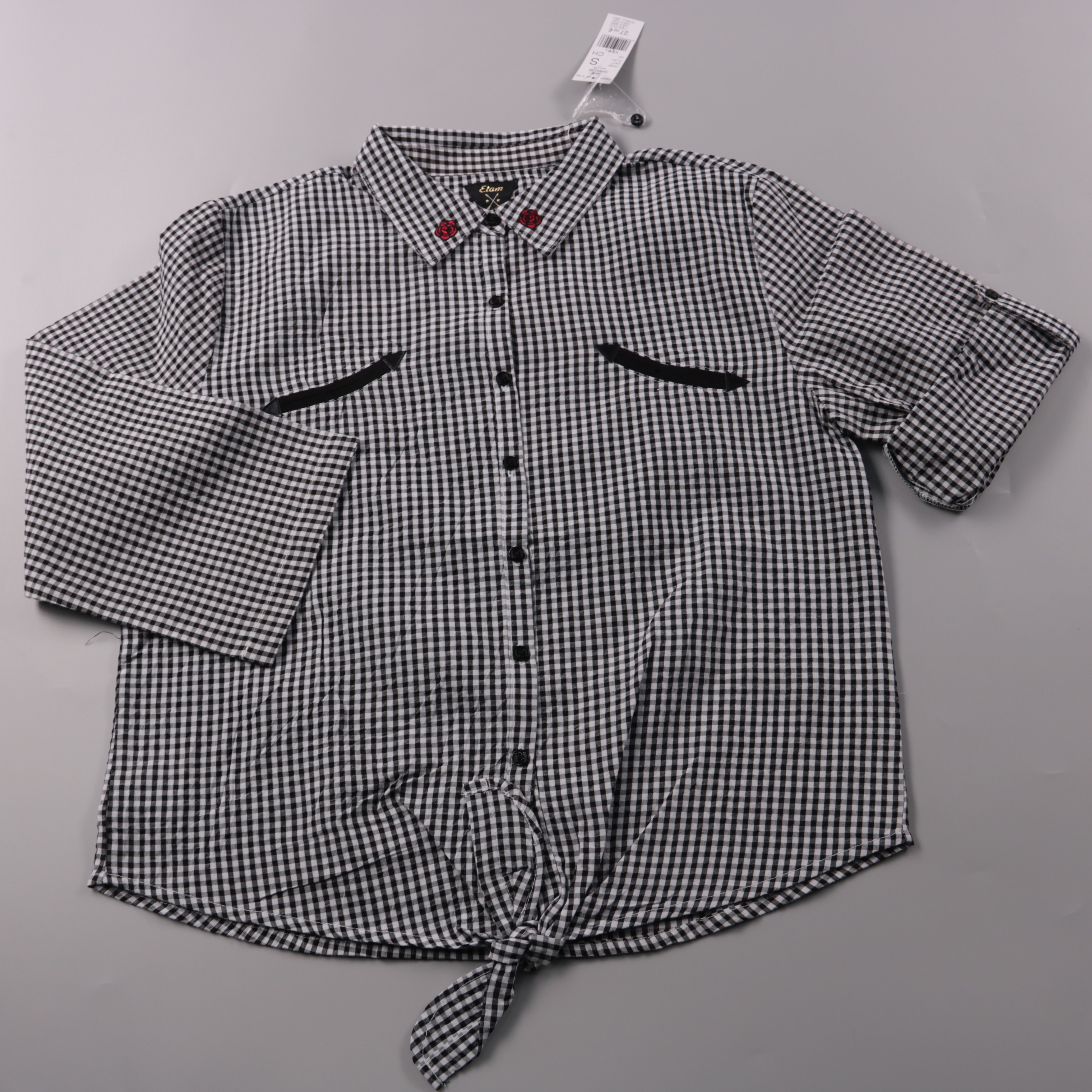Блузка Etam в черно-белую клетку, на пуговицах, с завязкой спереди и небольшими декоративными нашивками на воротнике. Подойдет для повседневных образов с джинсами или юбкой и для офиса в стиле casual. Практичный плюс — легкая ткань (хлопок с полиэстеро...