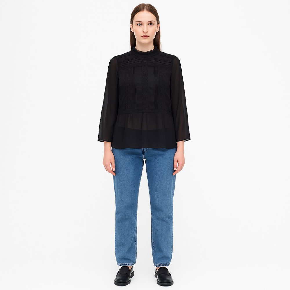 Чёрная блузка Vila из лёгкого полиэстера с полупрозрачными длинными рукавами и декоративными вставками спереди. Подойдёт для офиса и вечерних выходов, легко сочетается с джинсами и юбками. Материал почти не мнётся и быстро сохнет.