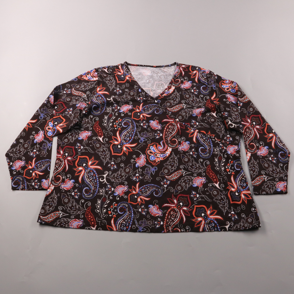 Женская блузка с длинным рукавом и V-образным вырезом, выполнена из мягкого трикотажа с ярким узором пейсли. Подойдёт для повседневных образов и офиса в сочетании с однотонным низом. Материал тянется и комфортно сидит, не стесняя движений.
