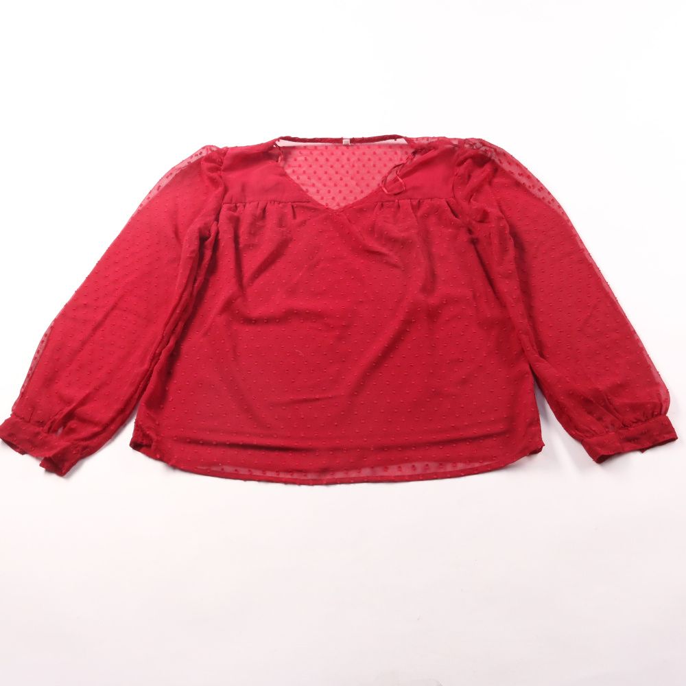 Лёгкая женская блузка из полупрозрачной ткани с фактурой в горошек и V-образным вырезом. Подойдёт для летних прогулок и вечерних выходов, хорошо сочетается с юбкой или джинсами. Материал тонкий и воздушный, поэтому в ней комфортно в жару.