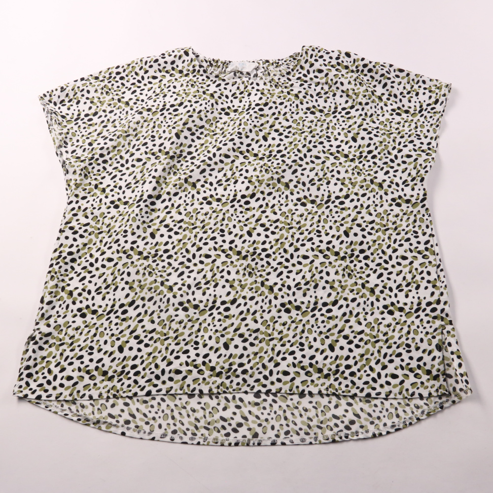 Блузка Primark с коротким рукавом и мелким пятнистым принтом в чёрно-оливковых тонах. Подойдёт для тёплой погоды и повседневных образов с джинсами или юбкой. Лёгкая ткань быстро сохнет и почти не мнётся.