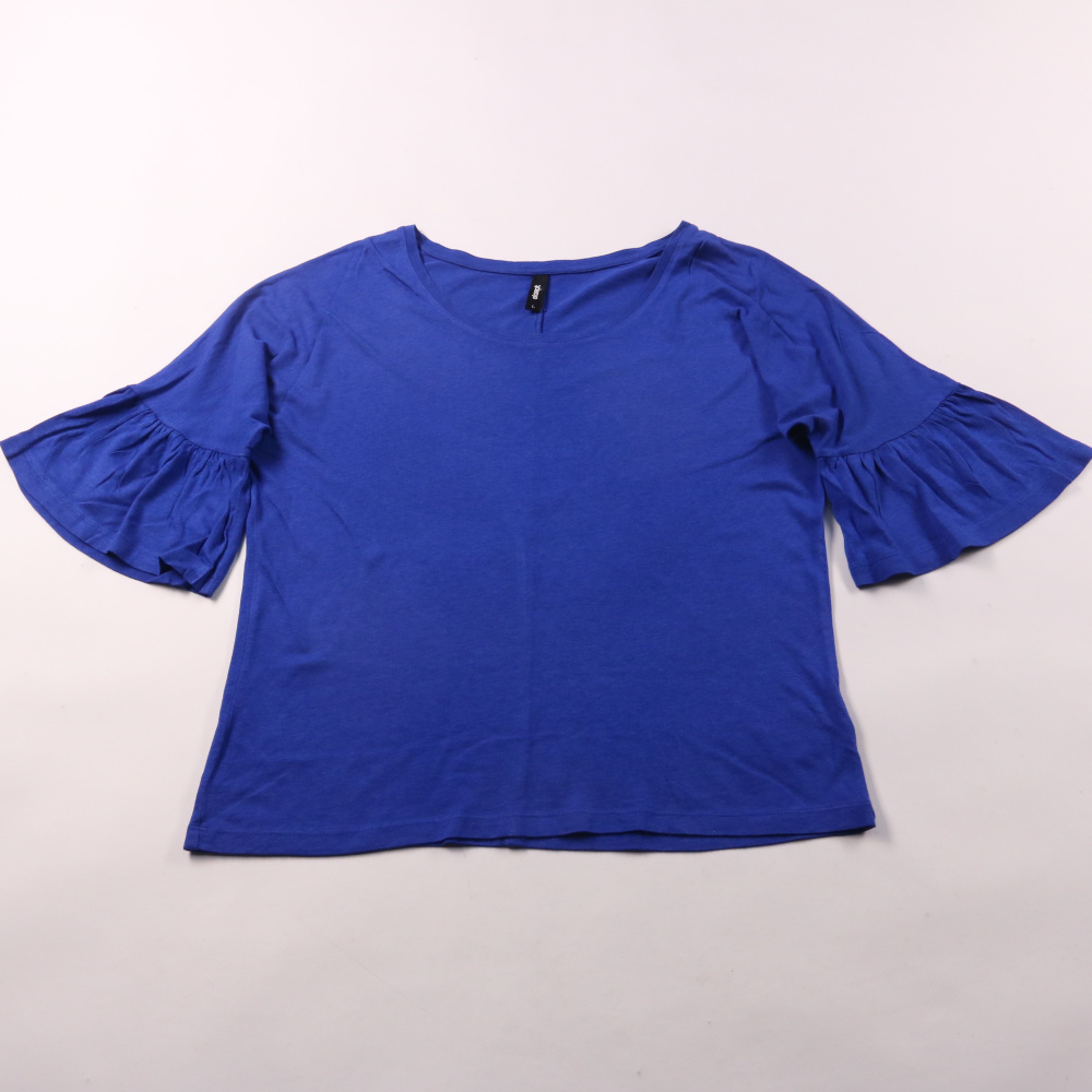 Синяя блузка Eksept из мягкого трикотажа с рукавами-воланами. Подойдёт для повседневных образов и офиса в сочетании с джинсами или юбкой. Материал с модалом приятный к телу и хорошо драпируется.