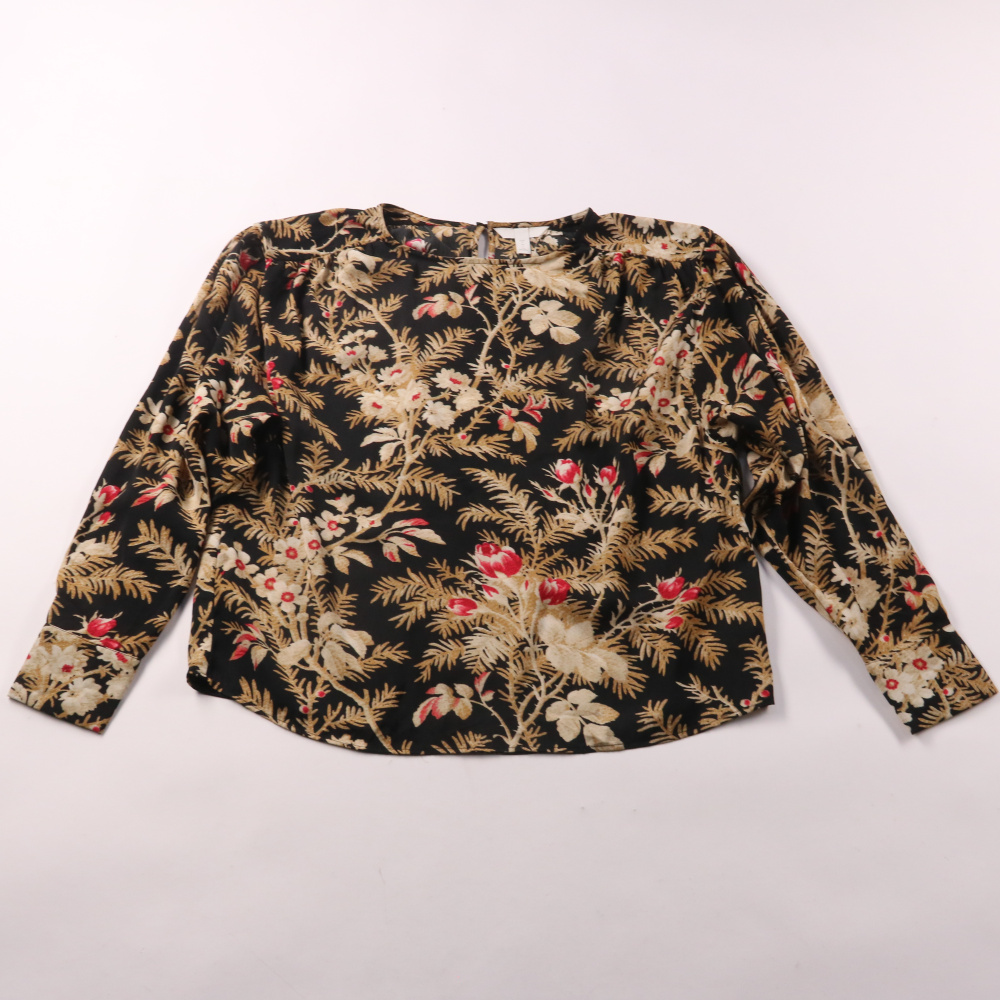 Женская блузка H&M с длинным рукавом и цветочным принтом на чёрном фоне. Подойдёт для повседневных образов и офиса в сочетании с джинсами или классическими брюками. Лёгкий полиэстер почти не мнётся и быстро сохнет.
