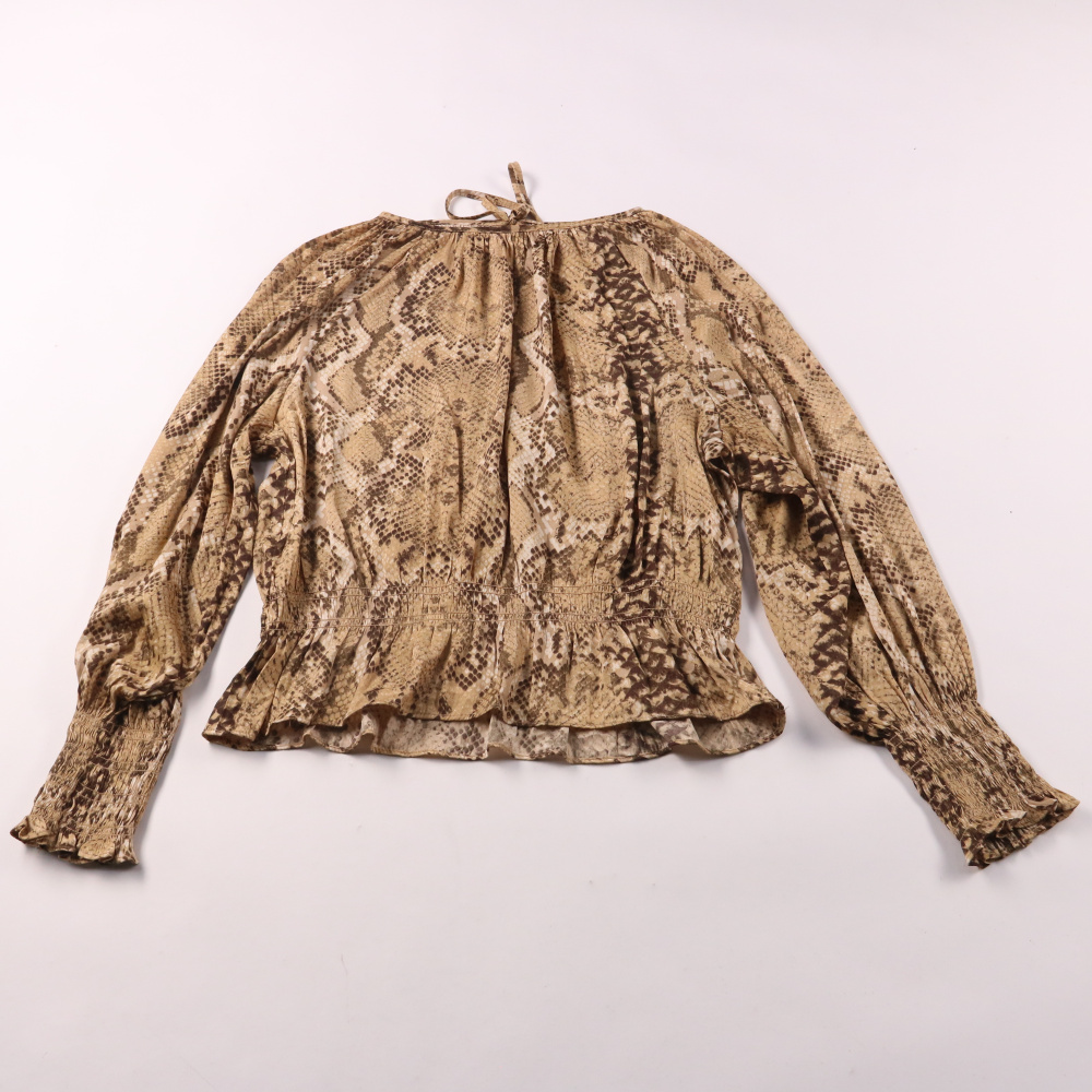 Блузка H&M с анималистичным (под питона) принтом, с длинными рукавами и сборкой на талии. Подойдёт для повседневных образов и выхода, хорошо сочетается с джинсами или однотонной юбкой. Лёгкая ткань из полиэстера почти не мнётся и быстро сохнет.