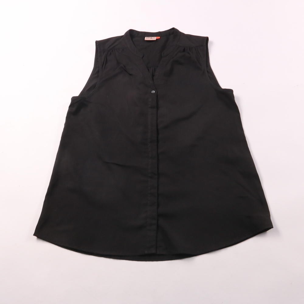 Чёрная блузка ONLY без рукавов, с V-образным вырезом и скрытой планкой на пуговицах. Подойдёт для офиса и повседневных образов, легко сочетается с брюками, джинсами и юбками. Полиэстер почти не мнётся и быстро сохнет.
