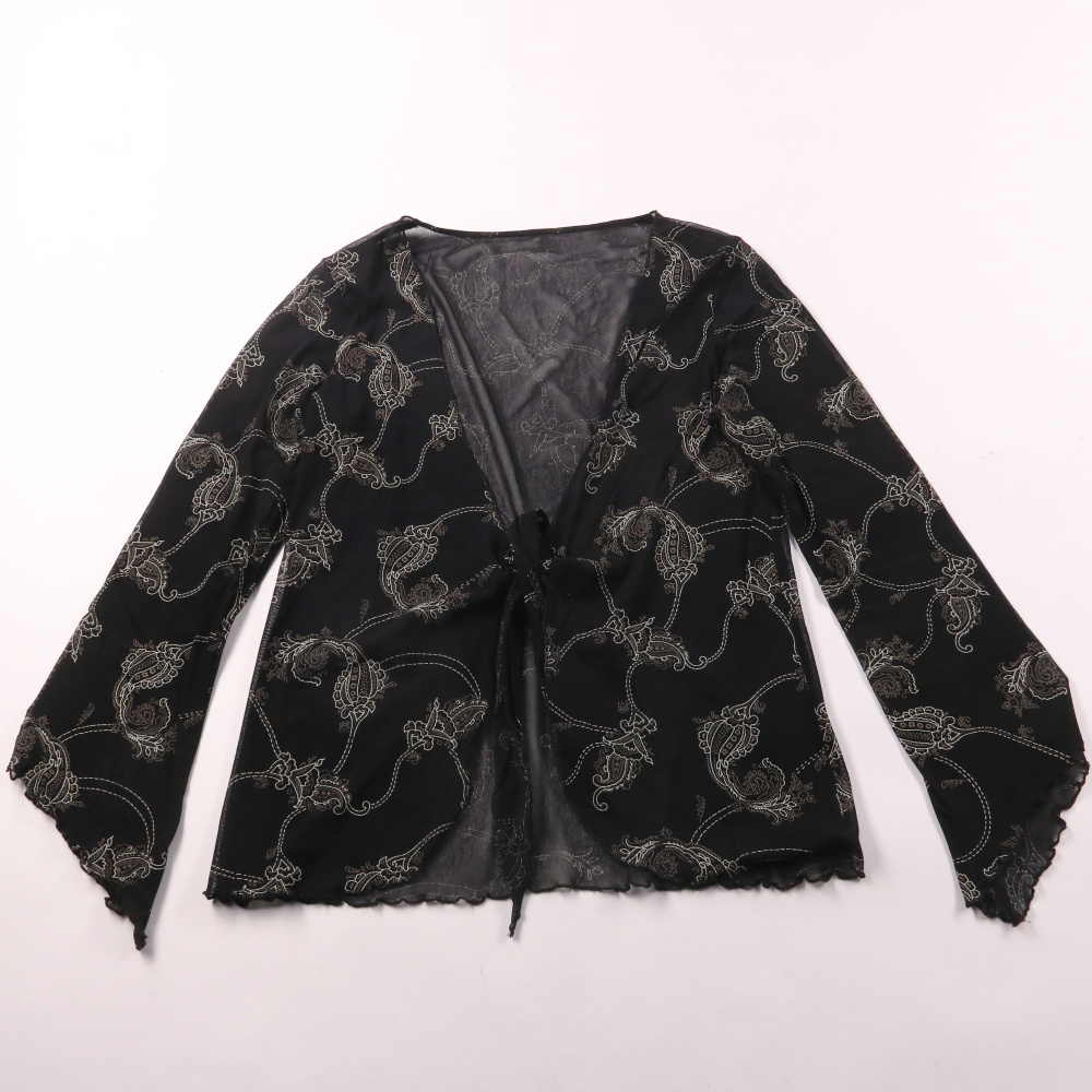 Лёгкая женская блузка из полупрозрачной ткани чёрного цвета с серым узором, на завязках и с длинными рукавами. Подойдёт для повседневных образов и на выход, можно носить поверх топа или платья. Ткань тонкая и почти не занимает места — удобно брать с со...