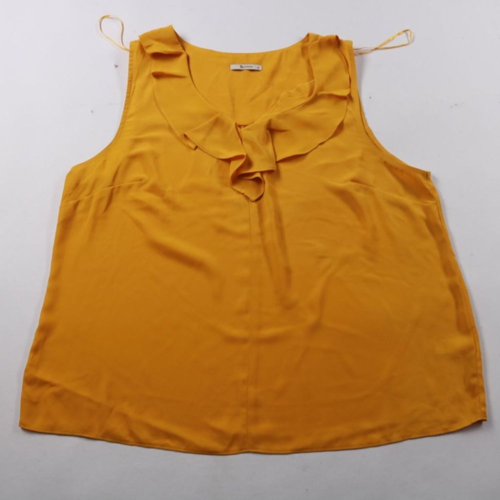 Женская блузка Tu горчичного цвета без рукавов, с мягкими воланами у выреза. Подойдёт для лета и тёплого офиса, легко сочетается с юбкой или брюками. Ткань лёгкая и быстро сохнет, удобно брать в поездки.
