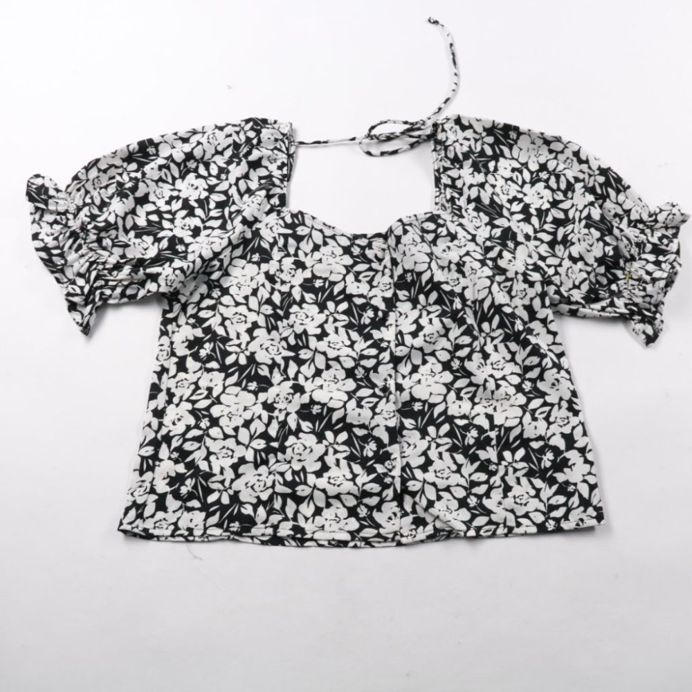 Лёгкая блузка Pep&Co с чёрно-белым цветочным принтом и короткими рукавами-буфами. Подойдёт для летних прогулок и отпускных образов, красиво смотрится с джинсами или юбкой. Полиэстер почти не мнётся и быстро сохнет после стирки.
