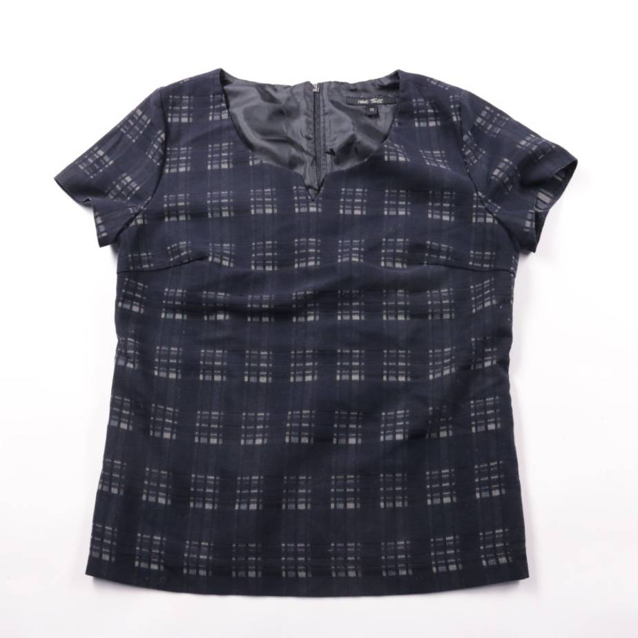 Блузка Next Tall тёмно-синего цвета в клетку, с коротким рукавом и V-образным вырезом на молнии. Подойдёт для офиса и повседневных образов с брюками или юбкой. Ткань почти не мнётся и проста в уходе.