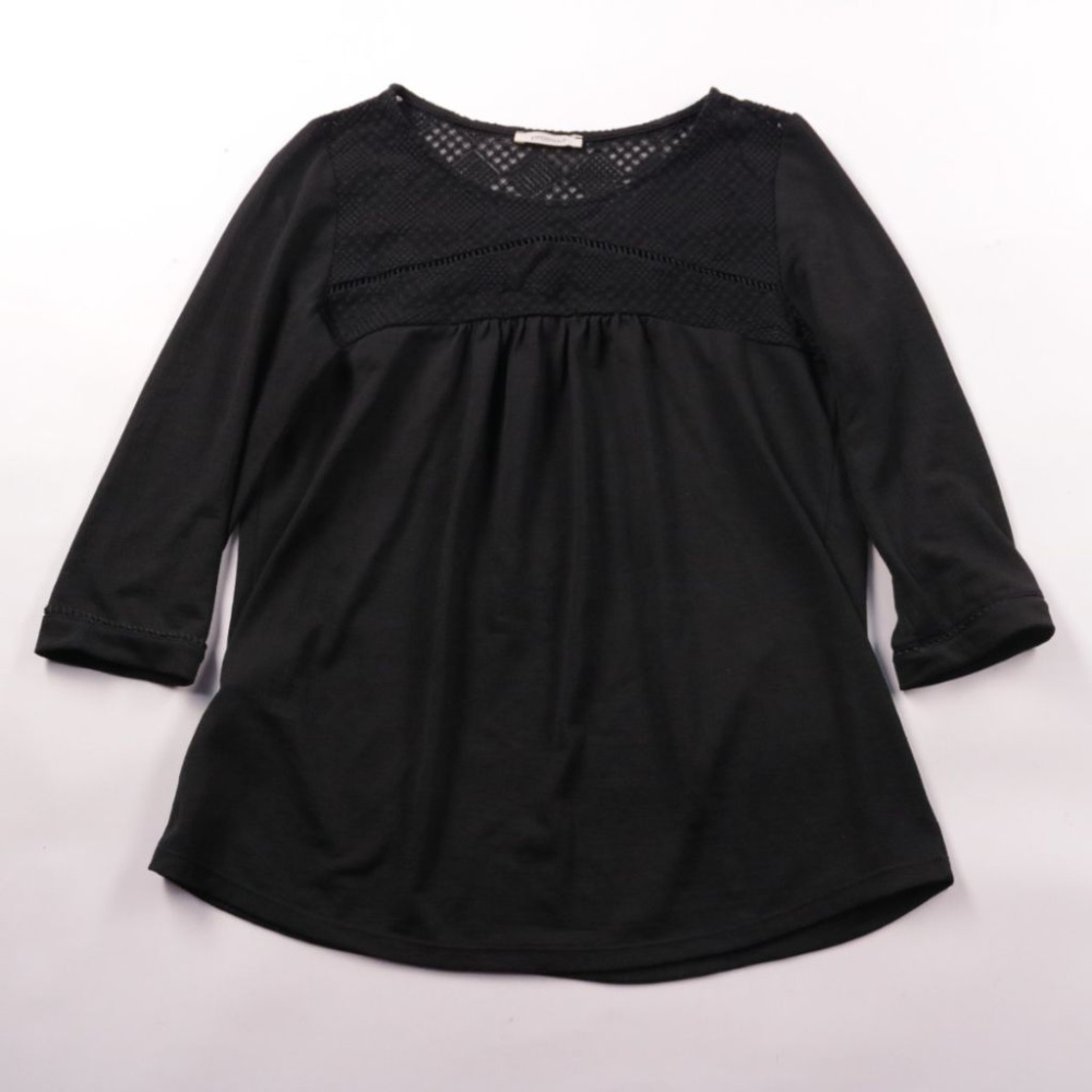 Чёрная блузка Promod с кружевной вставкой на кокетке и рукавом 3/4. Подойдёт для офиса и на выход, хорошо смотрится с джинсами или юбкой. Лёгкая ткань и свободный крой не сковывают движения и комфортны в течение дня.