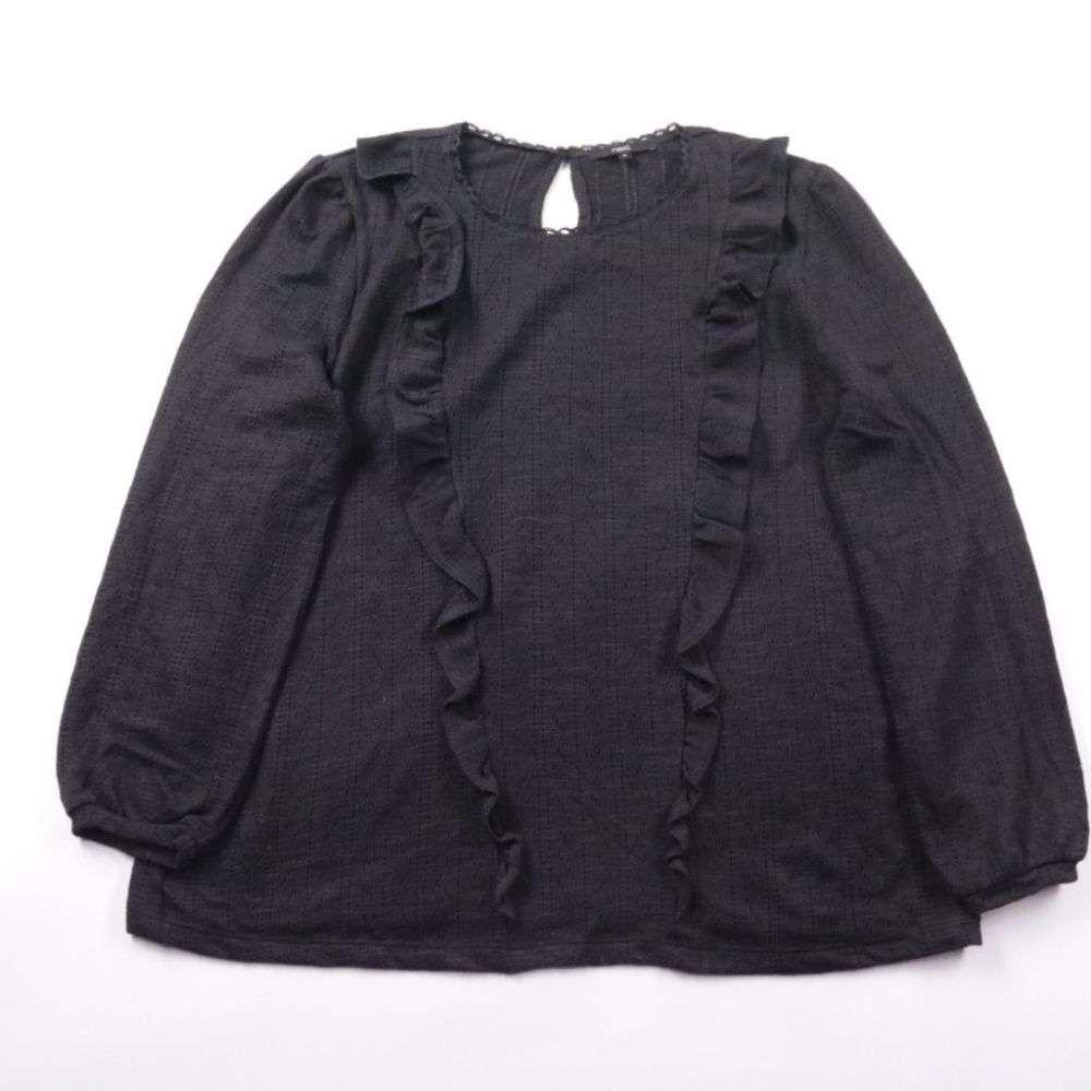 Чёрная блузка Next с длинным рукавом-фонариком и декоративными оборками по переду. Подойдёт для офиса и на выход, хорошо смотрится с брюками или юбкой высокой посадки. Практичный плюс — немаркий цвет и ткань, которая держит форму.