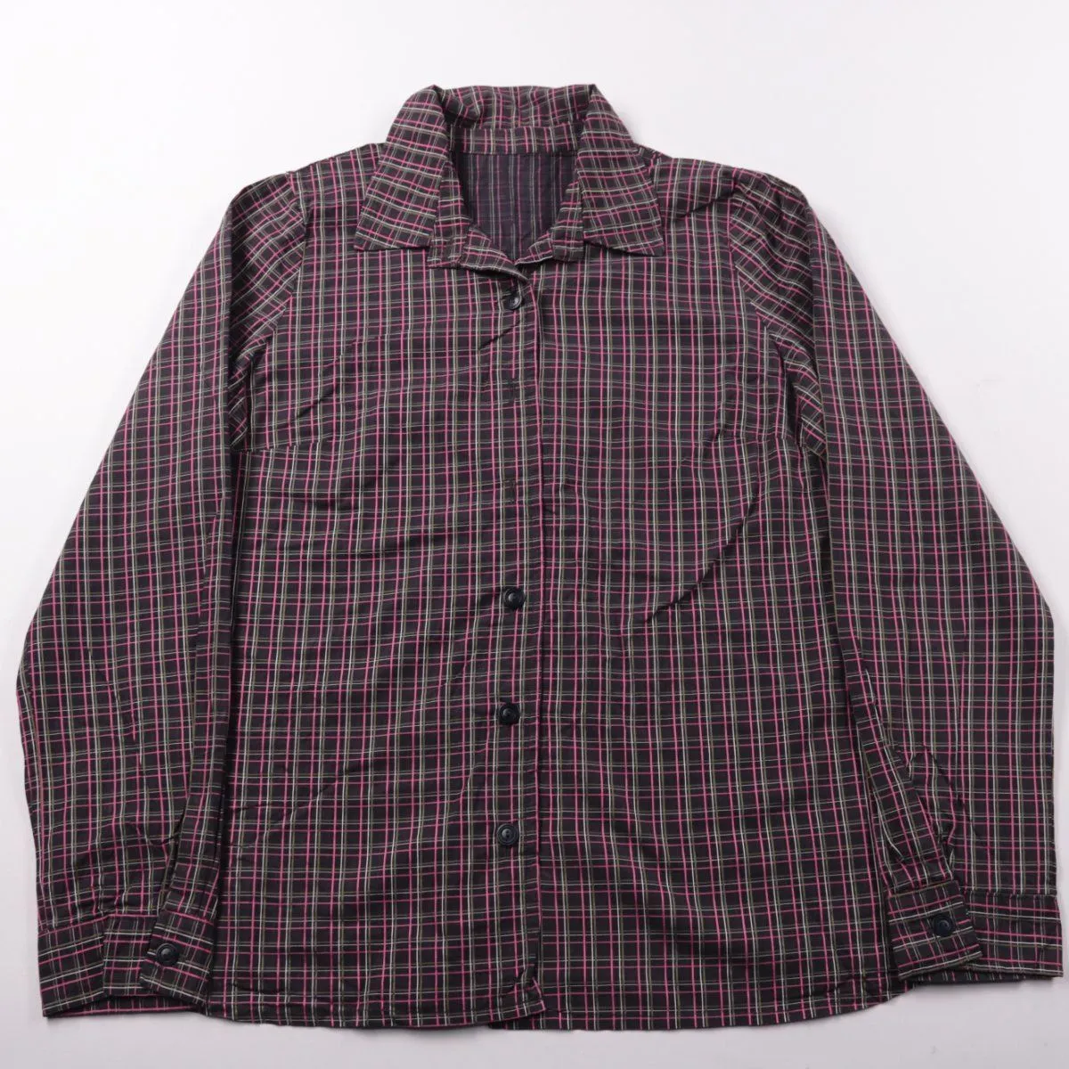 Женская рубашка в клетку на пуговицах, без указания бренда. Подойдёт для повседневных образов и в офис с джинсами или брюками. Практичный плюс — длинный рукав и плотная ткань хорошо держат форму и удобны для многослойности.