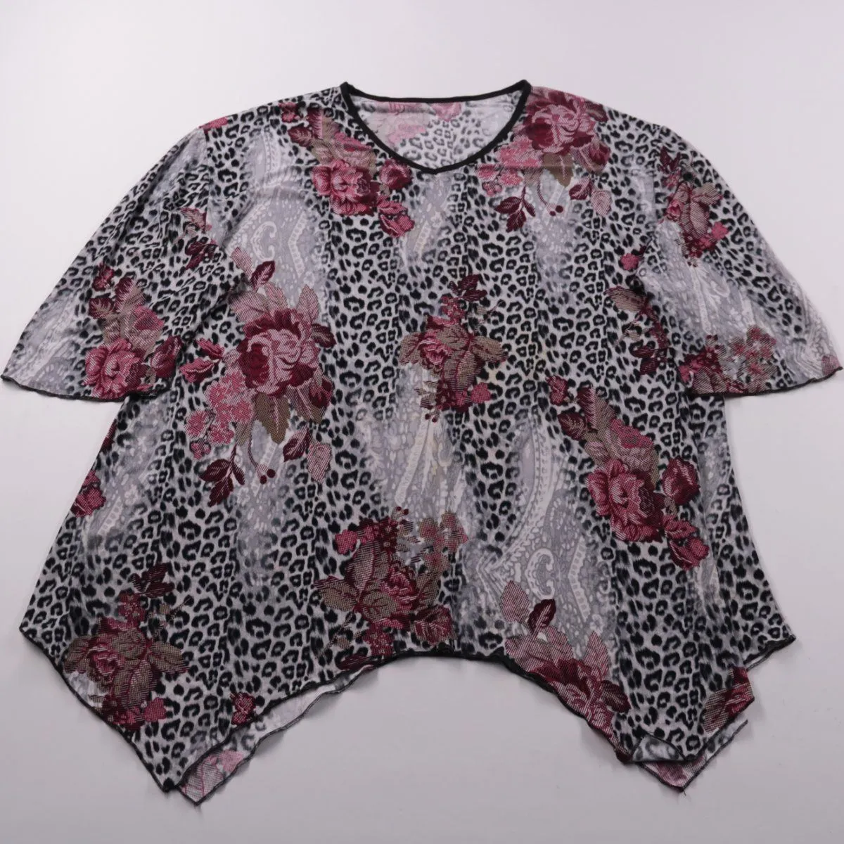 Женская блузка свободного кроя с коротким рукавом и асимметричным низом, принт — леопард и цветы. Подойдёт для повседневных образов и на выход, хорошо сочетается с однотонными брюками или юбкой. Лёгкая ткань почти не мнётся и быстро сохнет.