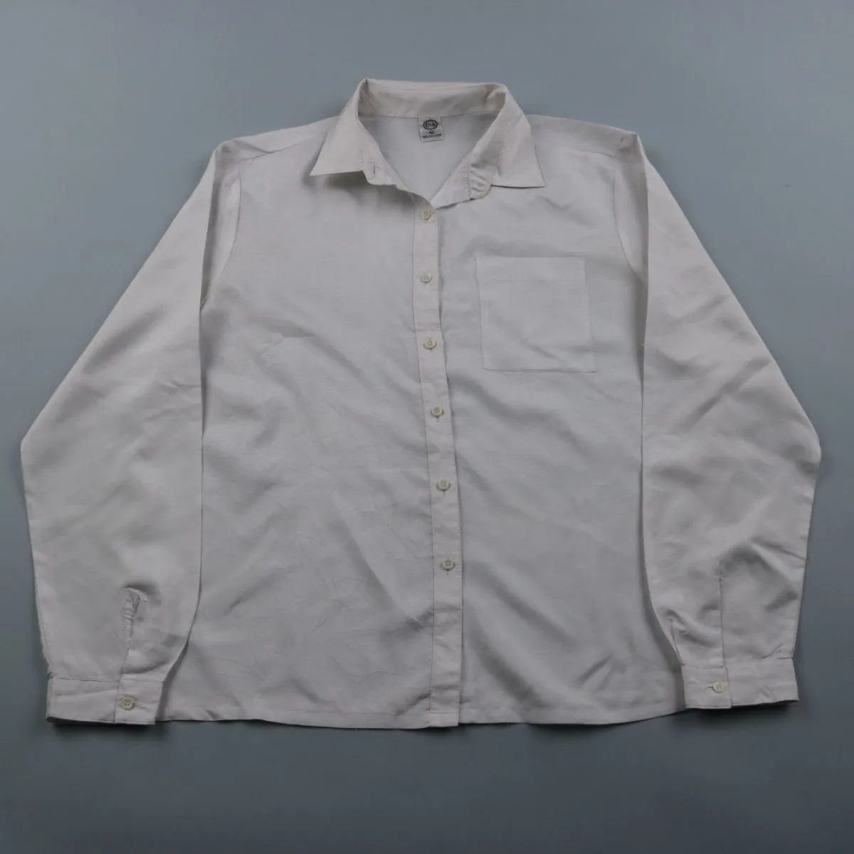 Женская рубашка C&A белого цвета с длинным рукавом и нагрудным карманом. Подойдёт для офиса, учёбы и базовых повседневных образов, хорошо сочетается с брюками и джинсами. Материал из 100% полиэстера — легко стирается и быстро сохнет.