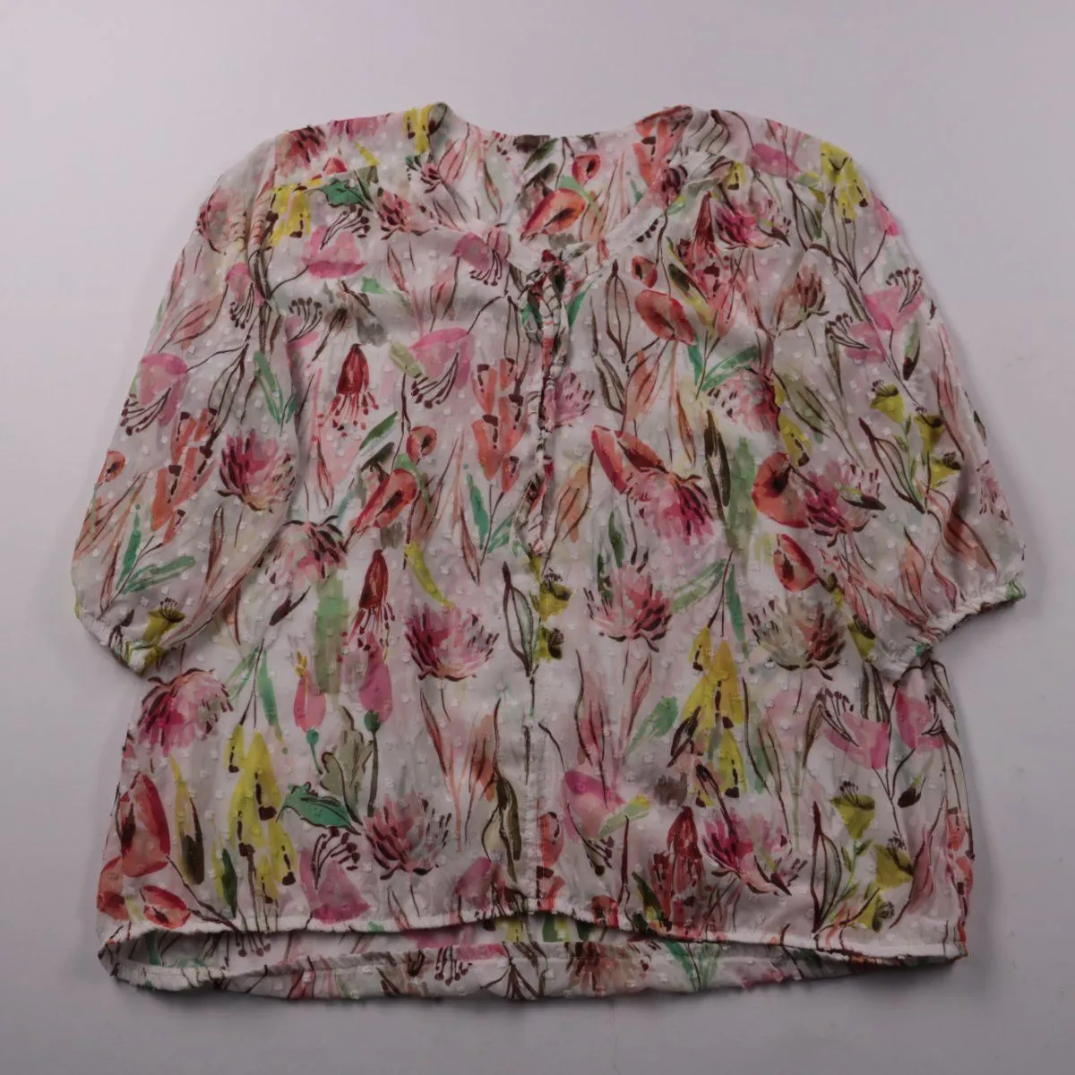 Лёгкая женская блузка с цветочным принтом и рукавом 3/4, подойдёт для повседневных образов в тёплую погоду и для офиса без строгого дресс-кода. Ткань полупрозрачная с фактурой в горошек (доби), смотрится нежно и хорошо сочетается с однотонным низом. Практичное преимущество — полиэстер почти не мнётся и быстро сохнет.