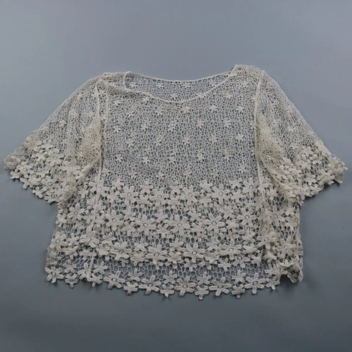 Ажурная женская блузка из кружева, без бренда, молочного цвета. Подойдёт для лета и тёплой погоды, хорошо смотрится поверх топа или платья для прогулок и выходов. Лёгкая и воздушная, почти не занимает места в сумке.