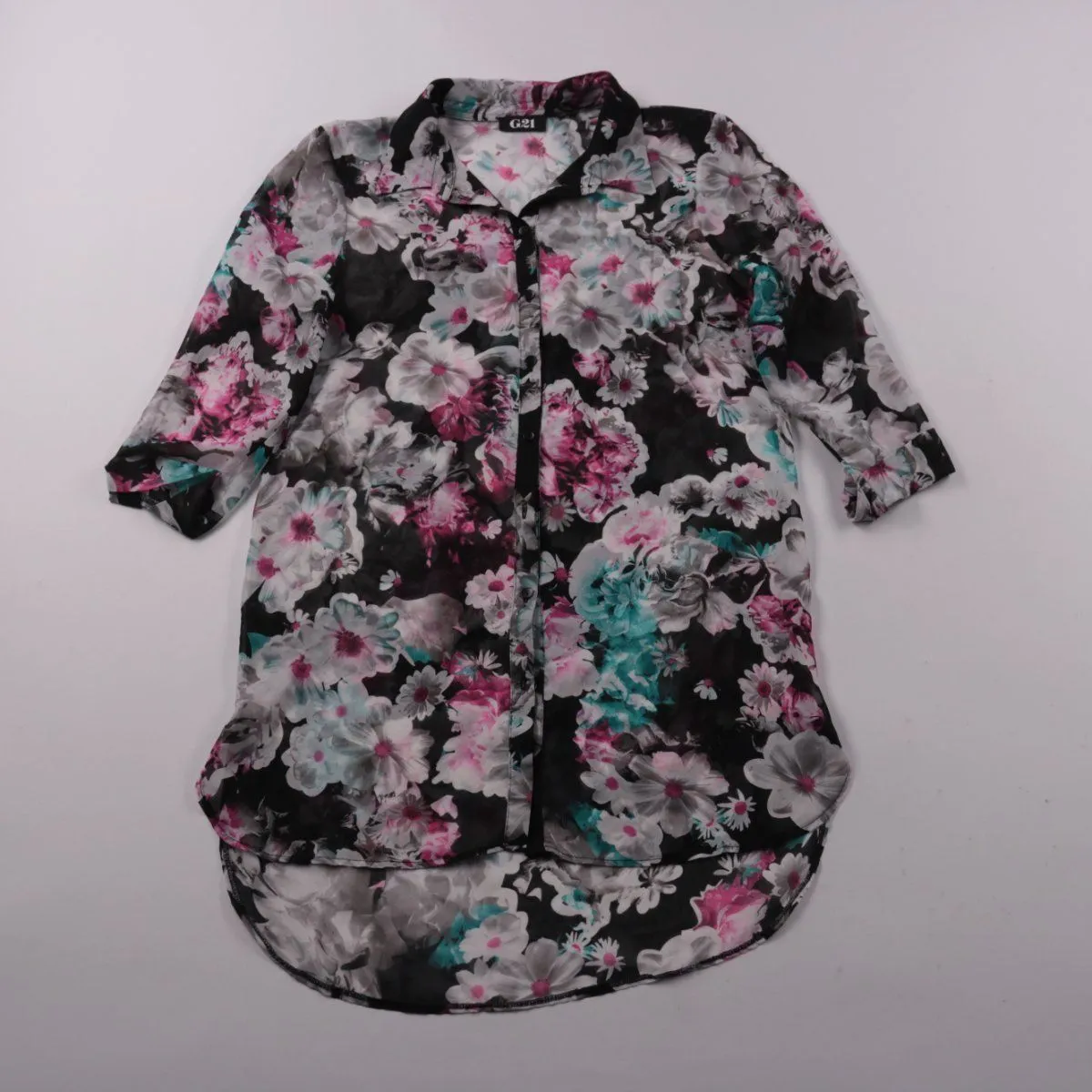 Женская рубашка G21 с цветочным принтом на тёмном фоне и удлинённой спинкой. Подойдёт для повседневных образов и офиса в сочетании с брюками или джинсами. Лёгкая ткань и свободный крой комфортны в течение дня.
