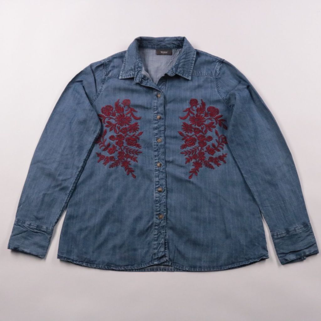 Джинсовая рубашка Yessica из мягкой ткани под деним, с застёжкой на пуговицы и отложным воротником. Спереди бордовая цветочная вышивка — подойдёт для повседневных образов с джинсами или однотонной юбкой. Практичный плюс: лиоцелл приятный к телу и хорош...