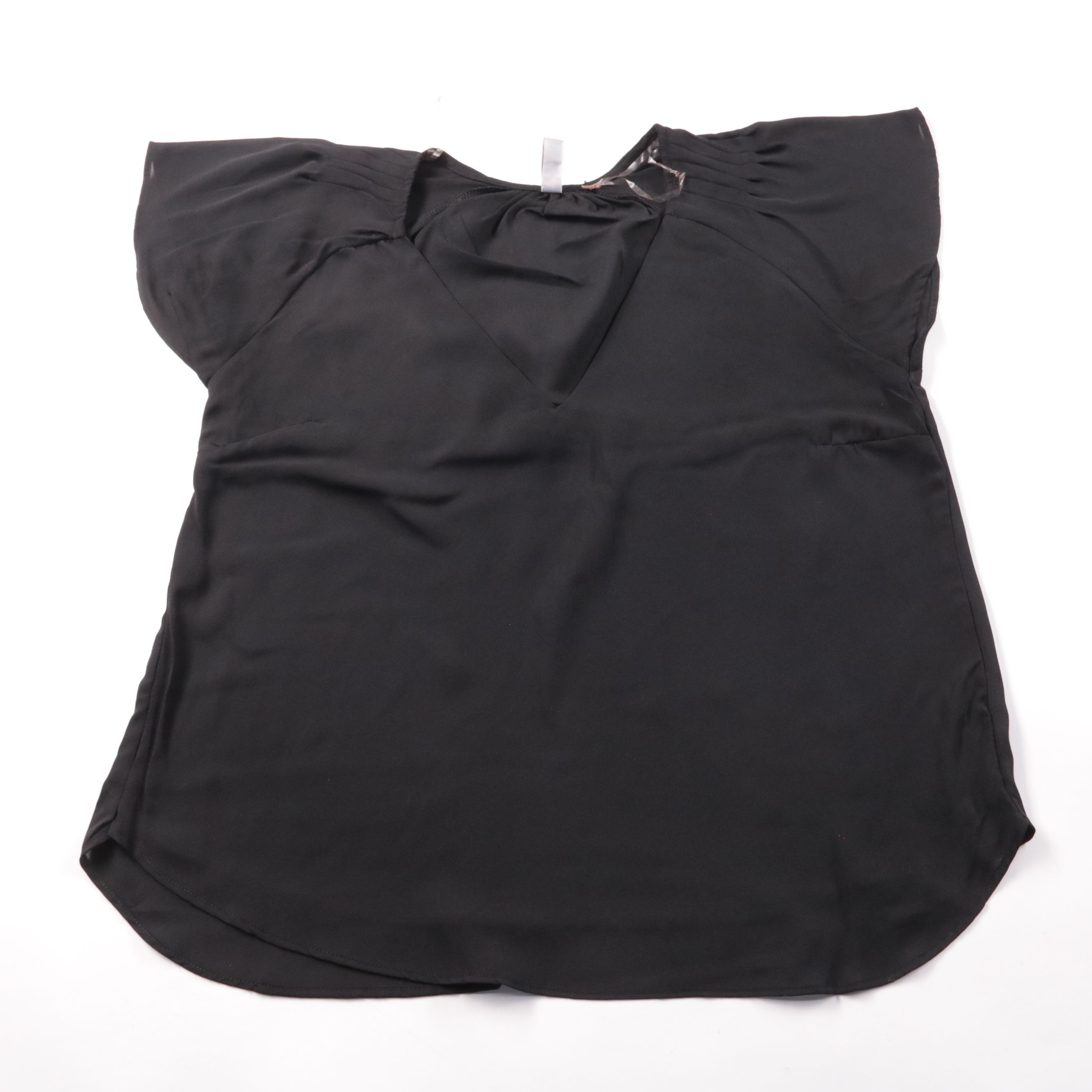 Чёрная блузка Amisu с V-образным вырезом и коротким рукавом. Подойдёт для офиса и повседневных образов, хорошо сочетается с брюками и юбками. Лёгкая ткань удобно носится под жакет или кардиган.